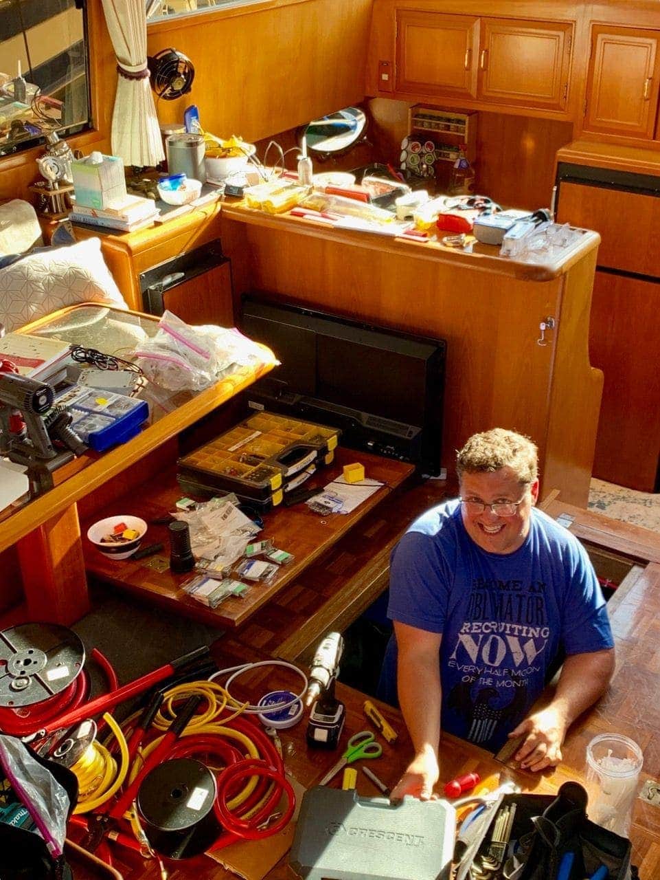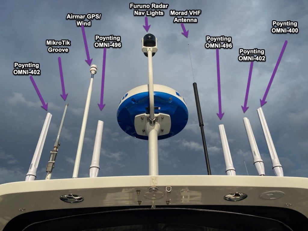 Above the sun deck is a beautiful arch that is motorized, and lowers down to the deck for storage. I plan on using that feature to allow me to add/remove antennas, test devices, and tons of other stuff without dealing with a ladder. I’ve upgraded everything up here in the last few months to include a new Furuno DRS4D-NXT radar, Wilson LTE antenna, MikroTik Groove WiFi booster, LCJ Capteurs Ultrasonic wind sensor, and LED navigation lights.