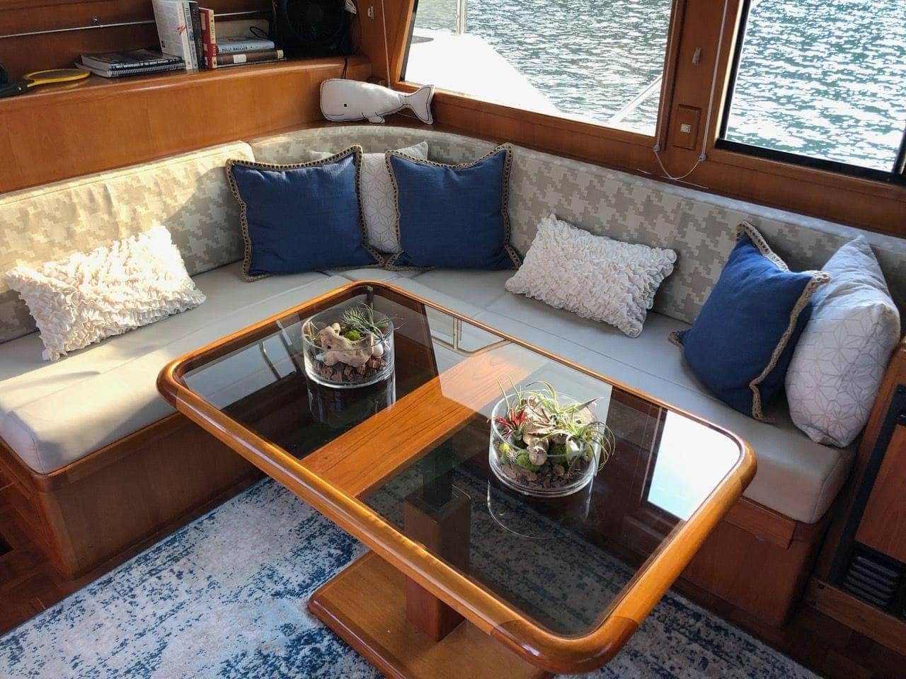 The main salon area has an L-shaped couch with a nice height adjustable teak/glass table. One of the things I love about the main area is all of the low windows which let you see out even while sitting. For someone who gets seasick easily, that is super nice.