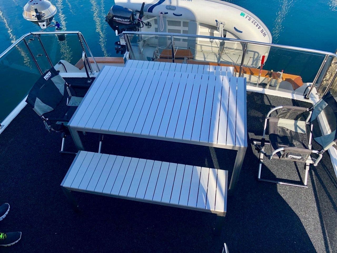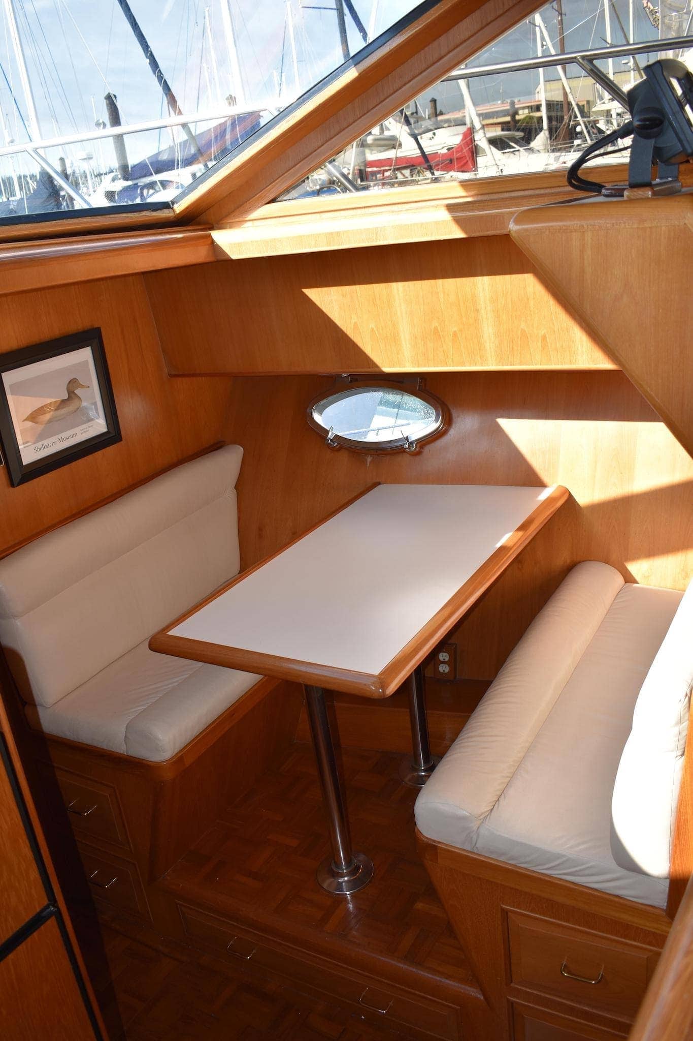 Stepping down forward from the salon, to the right is the 4 person dinette, which has a hidden second freezer underneath the seat for longer trips.