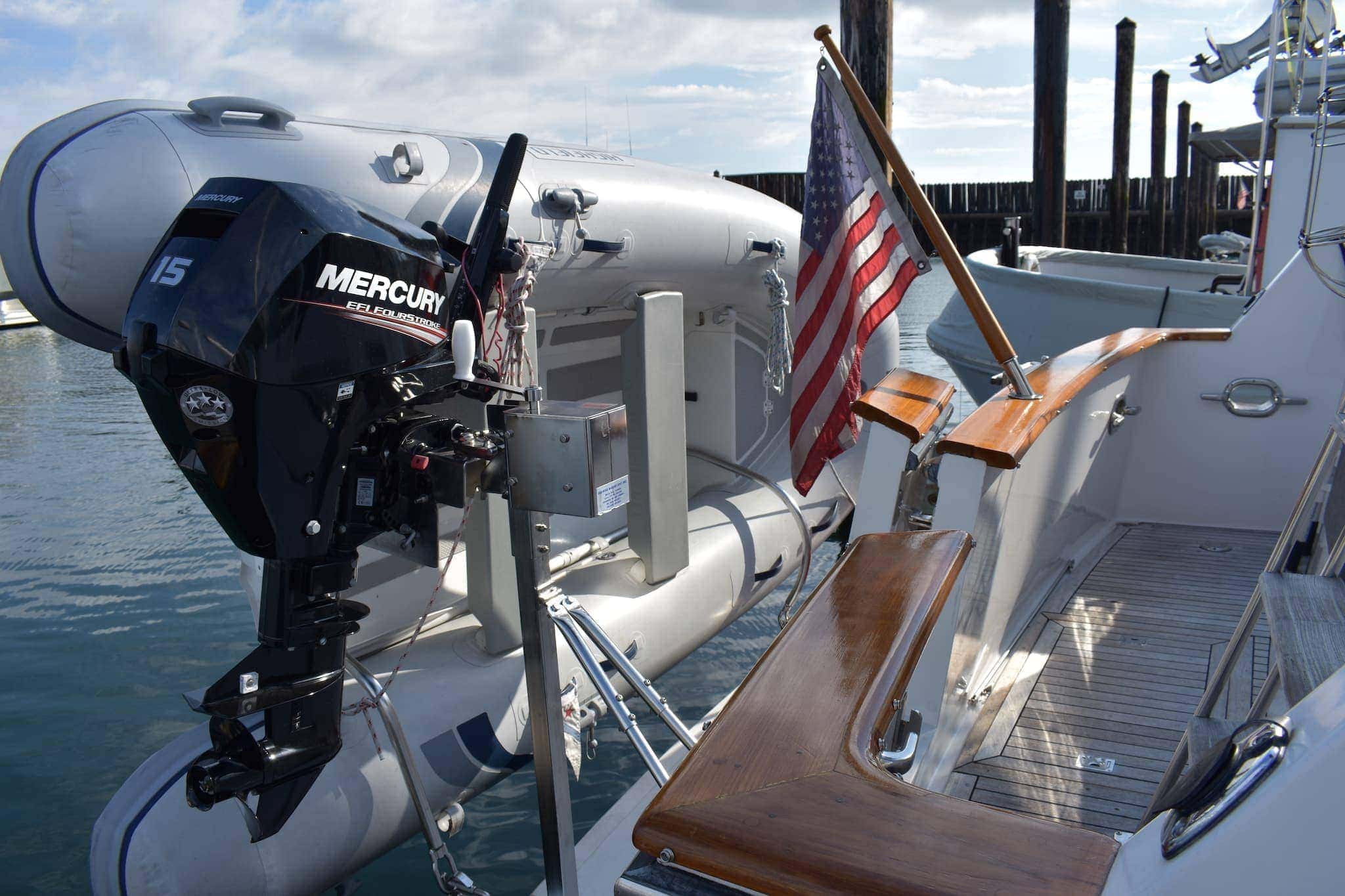 Enter via a large swim step with the 10′ Highfield dinghy and outboard held in place by a SeaWise davit system. The cockpit has space for line handline, buoy storage, and a lazarette with tons of storage.