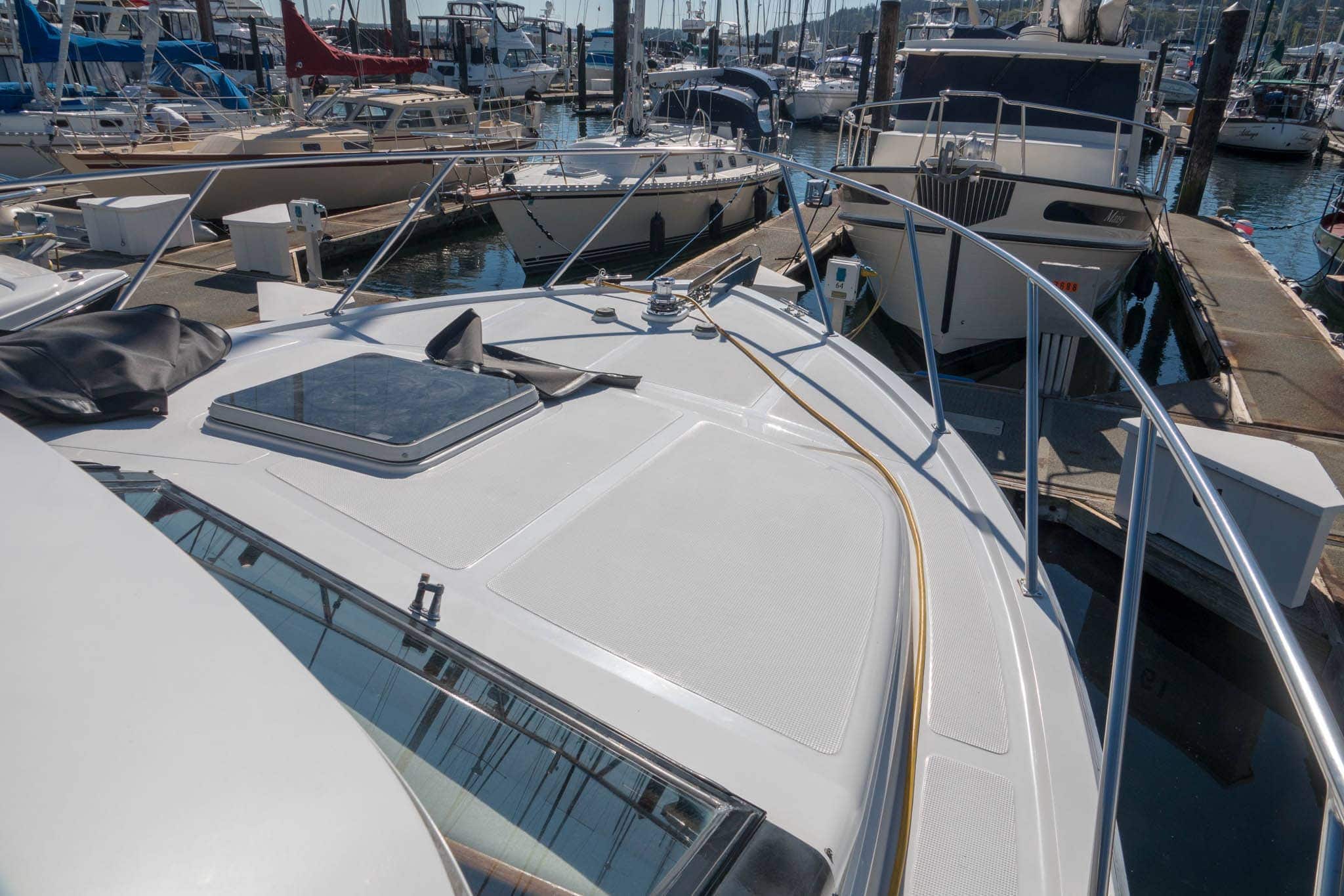 The entire deck is enclosed with high railings, with walkable side decks up from the sun deck to the bow. The bow has a lot of space and a nice speedy Maxwell windlass along with the usual deck wash down.