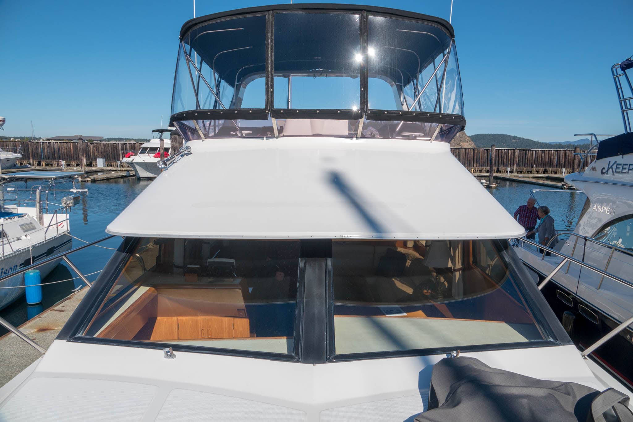 Looking back at the flybridge, you can see the full enclosure and big windows below into the salon.