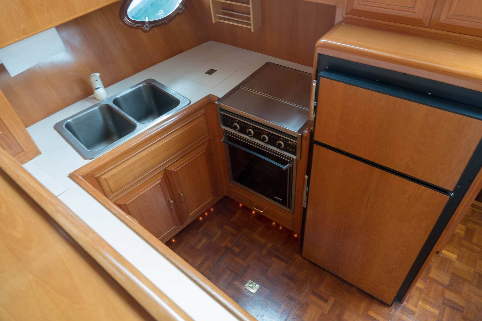 To the left is the galley which has a bunch of great counter space, drawers galore, stove and oven, and a Sea Freeze fridge/freezer, plus a hidden away microwave.