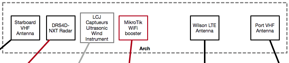 The arch houses mostly antennas and sensors that need to be up away from things. The biggest one is the Furuno DRS4D-NXT radar, which has an Ethernet connection back to the Furuno Ethernet Switch. In addition, the Wilson marine LTE antenna and MikroTik WiFi extender are also mounted here, both with connections back to the Internet Alcove.
