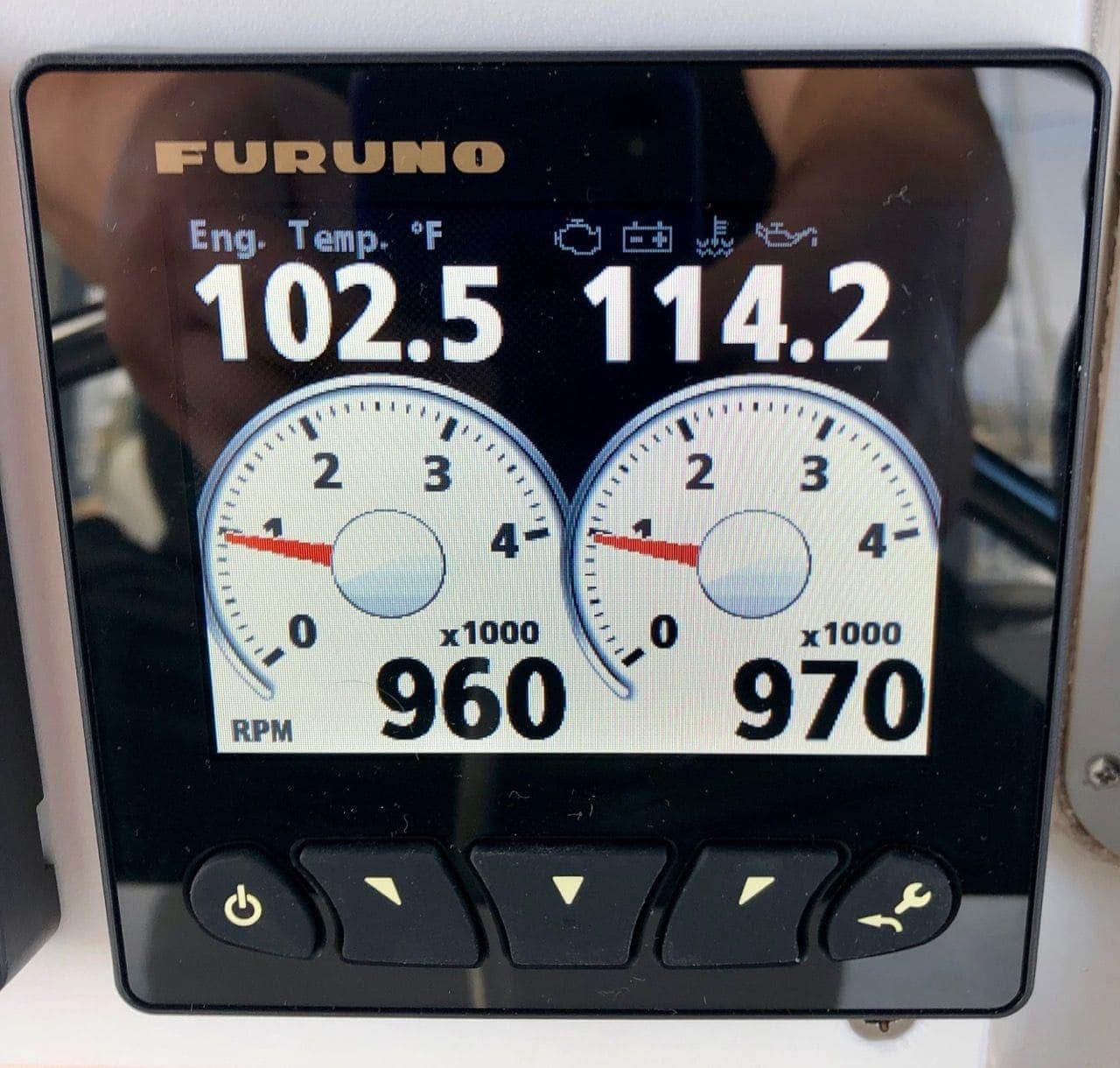 There is also a Furuno FI-70 display in this location only, connected to NMEA 2000 for network and power. The flybridge station has a truncated version of the engine gauges available at the salon driving station. In addition, when the throttles and gear levers are engaged while underway, they block some of the gauges requiring you crane your neck or look underneath them to see RPMs and other things. The FI-70 has a fantastic single-screen, dual engine display that allows me to see everything very quickly from any chair position, as well as things like boost pressure and other data courtesy of the Actisense EMU-1 engine monitor I installed.
