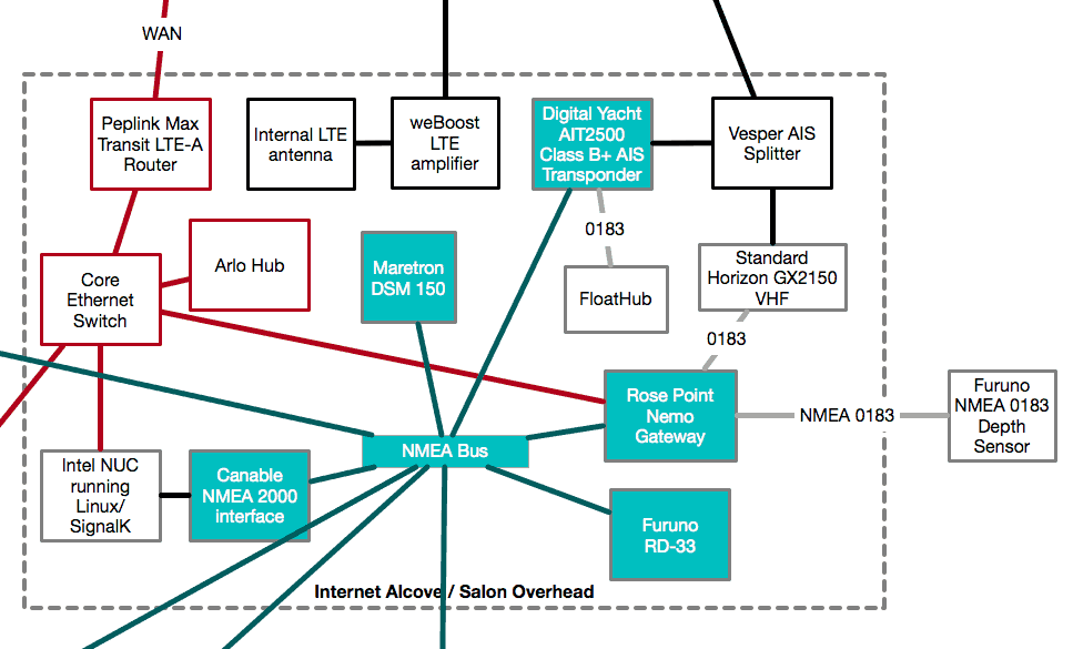In the last 4 months, I have been developing my overall network on board Rendezvous. I wanted a good WiFi/Ethernet network to connect me to the outside world, as well as a well developed NMEA 2000 network for marine equipment while underway. So far, here’s what I have…