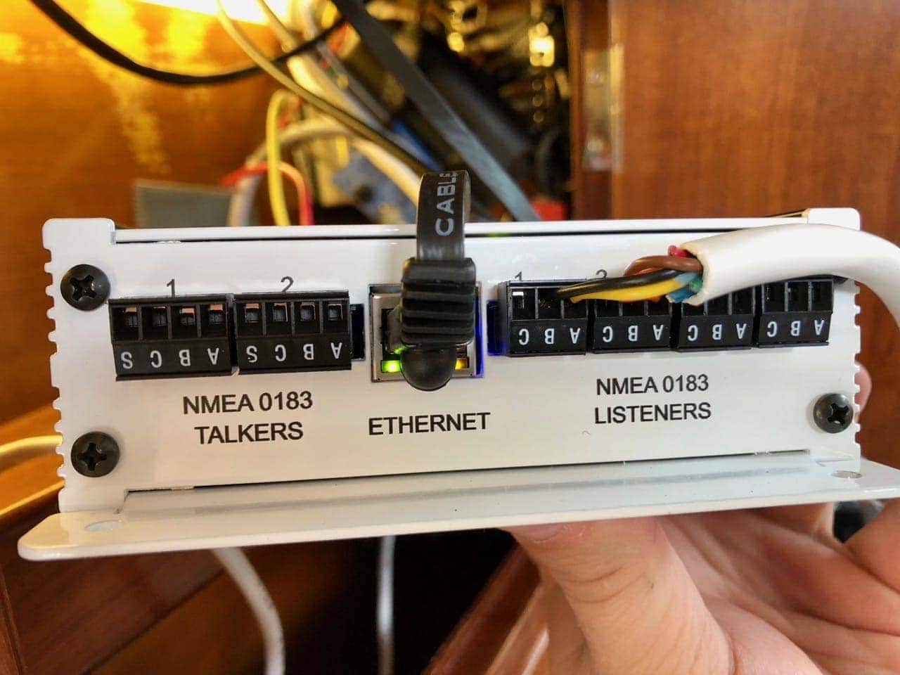 The Rose Point Nemo gateway is in the alcove as well, and has a number of things connected to it. Most importantly, I have a legacy NMEA 0183 depth / speed sensor that is connected directly to the Nemo. It converts that to NMEA 2000 so all other devices on the boat can consume depth and speed through water. I would like to replace this with a NMEA 2000 sensor that might also include water temperature, but I haven’t gotten around to it. The cable run is also not an easy one…