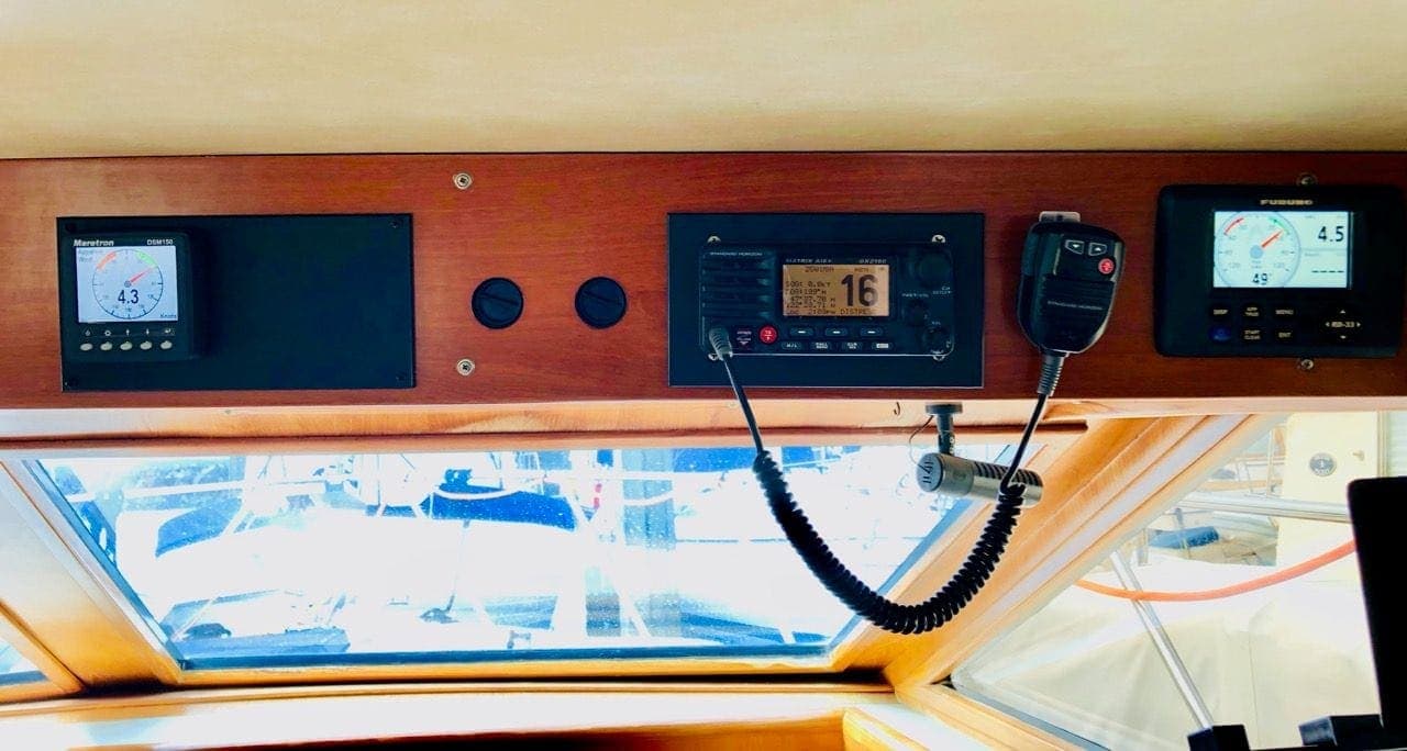 On the outside of the alcove there are a few instruments mounted for ease of use while in the salon area, and at the driving station. They include a Maretron DSM 150 display, Furuno RD-33 display, and a Standard Horizon GX2150 VHF. The Maretron and Furuno are connected to the NMEA 2000 bus, while the Standard Horizon VHF uses NMEA 0183 to the Rose Point Nemo gateway. The Maretron DSM is kept on 24×7 and faces out into the salon area so as you’re walking by or enjoying the views from the couch, you can still see critical info scrolling by.