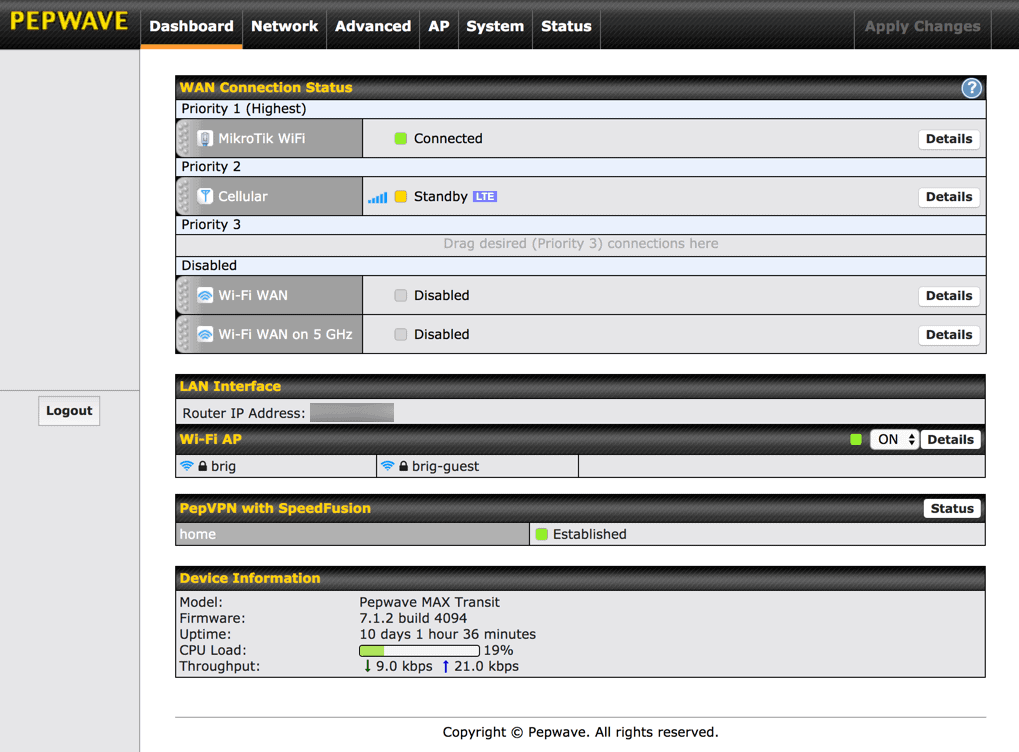 - Internet & Connectivity – Peplink + weBoost amplifier, MikroTik WiFi extender