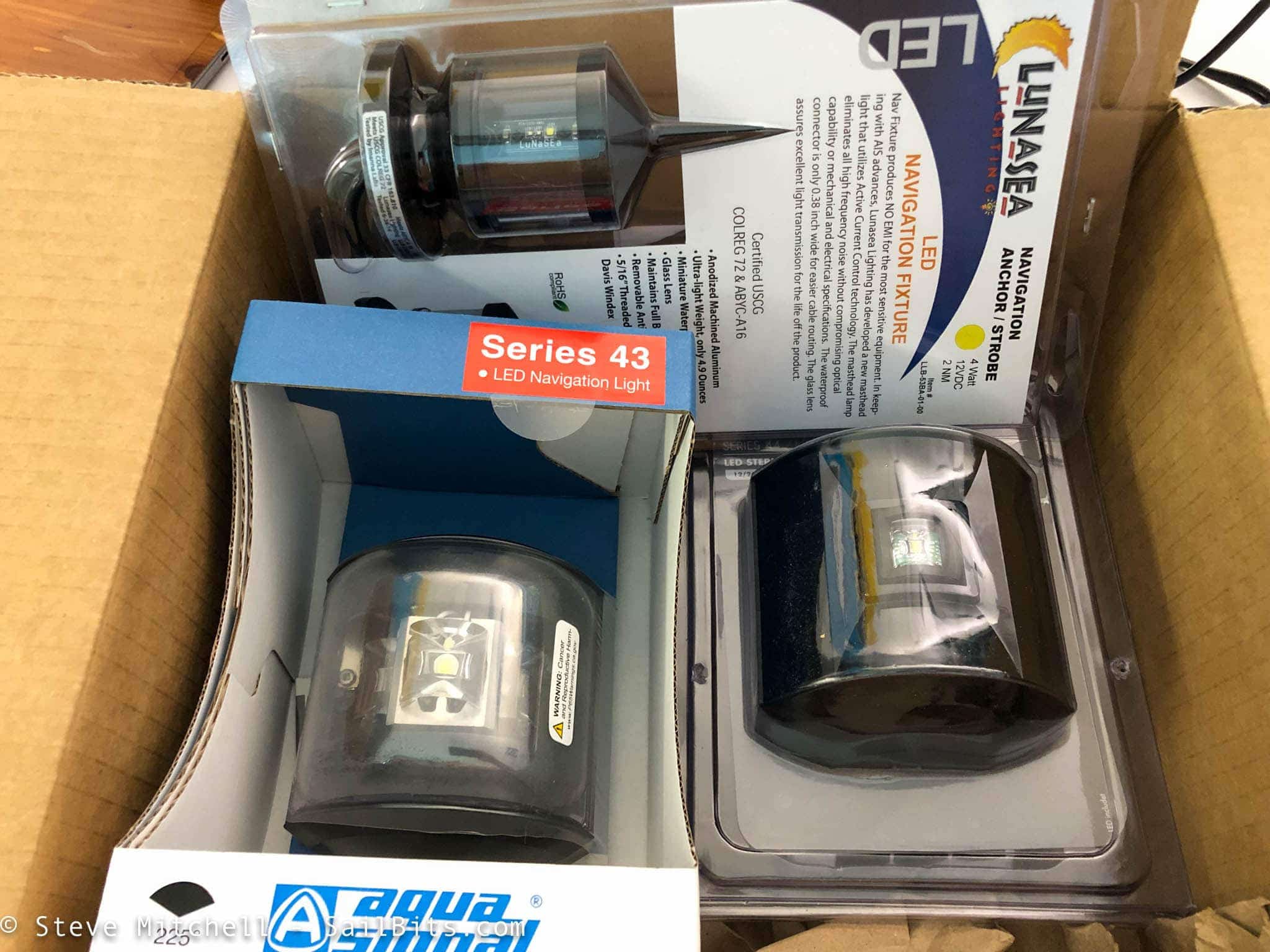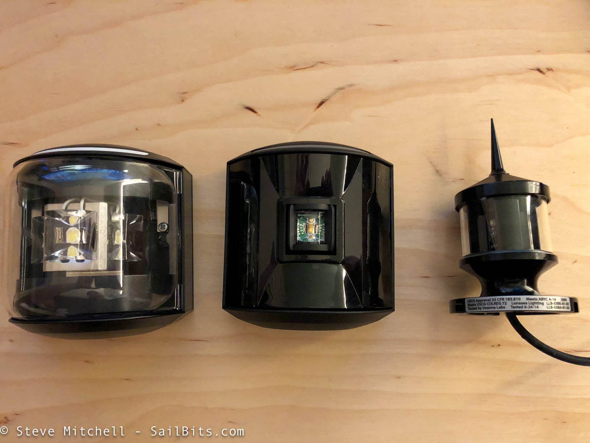 For the forward steaming light, an Aqua Signal Series 43 in black. For the stern light, I chose an Aqua Signal Series 44 in black as well. For the anchor light, I chose the same wonderful light I used on Grace when I did major mast work, the LunaSea anchor light – this thing is a like a mini-sun at night, and has a sensor to turn the light on and off at dusk and dawn respectively, plus a nice bird spike to keep things clean.