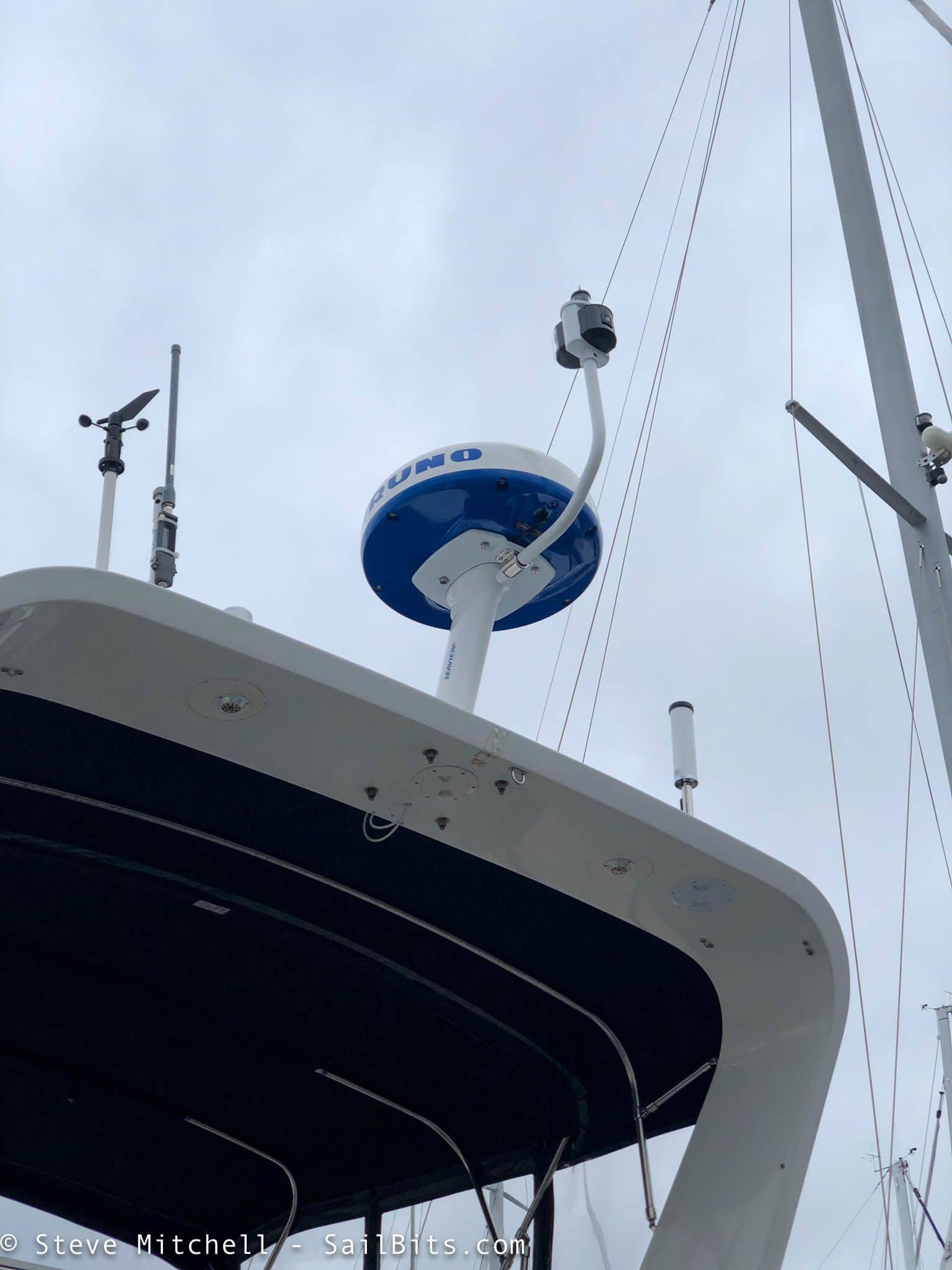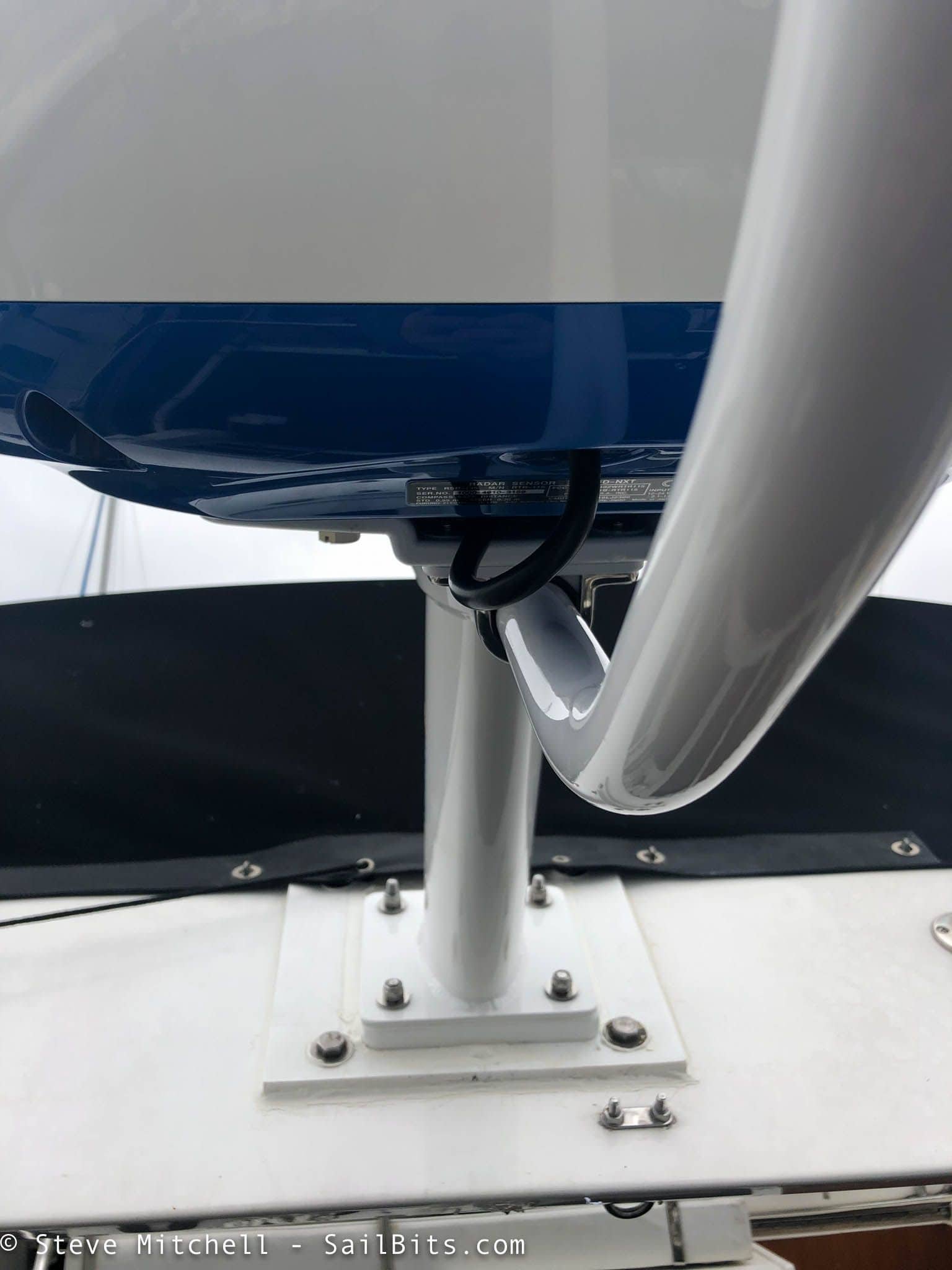 The first step was to get the mount attached to the arch in a secure way. I didn’t take a picture during this phase, so the photo is a bit out of order, already showing the radar mounted. Nevertheless, I ended up mounting a nice thick piece of star board using the existing large bolts from the previous, and much heavier, radar. Then I mounted the provided seal, wedge base, and then the base of the mount itself using large bolts up from the bottom of the star board, inset tightly.