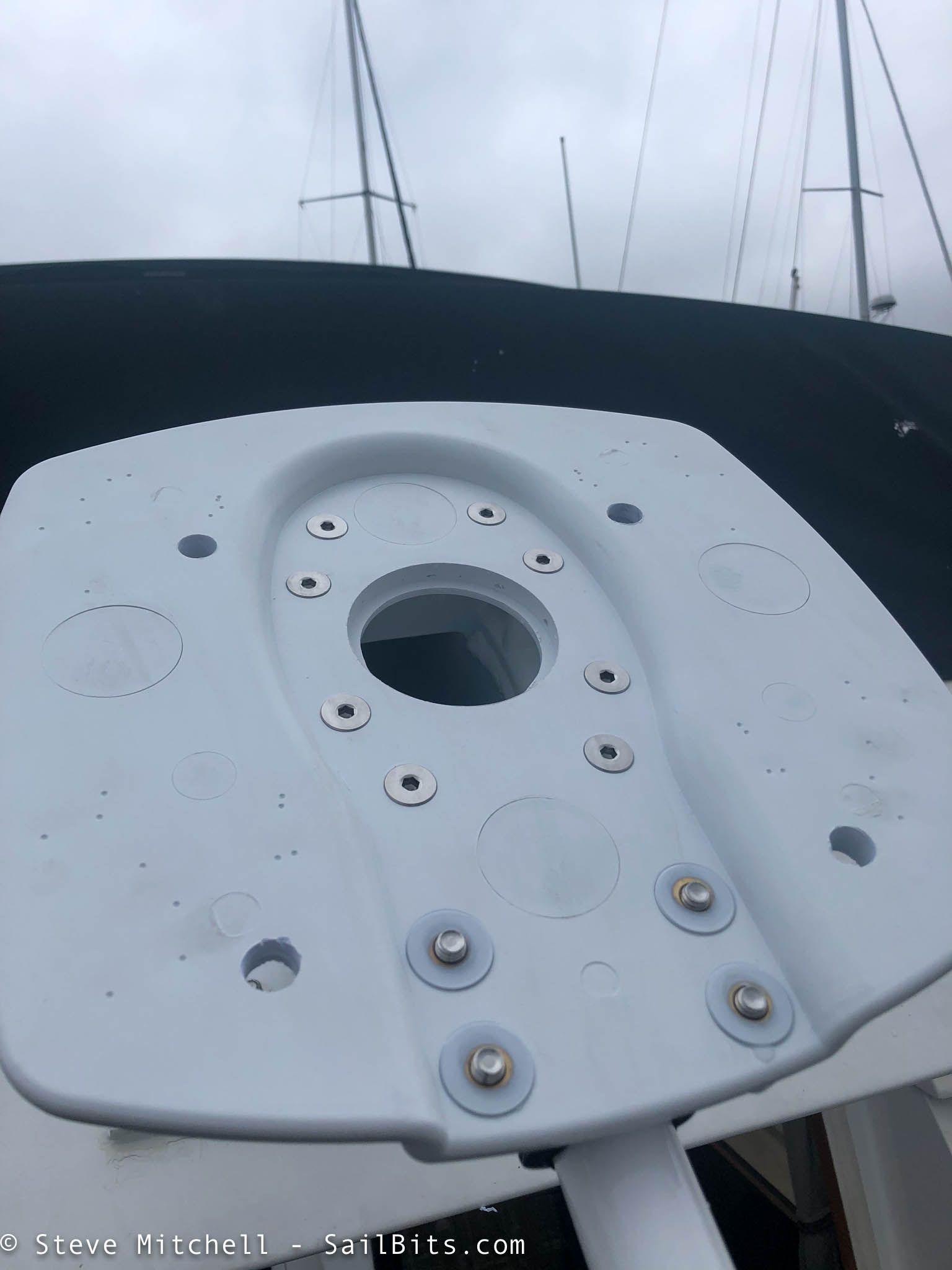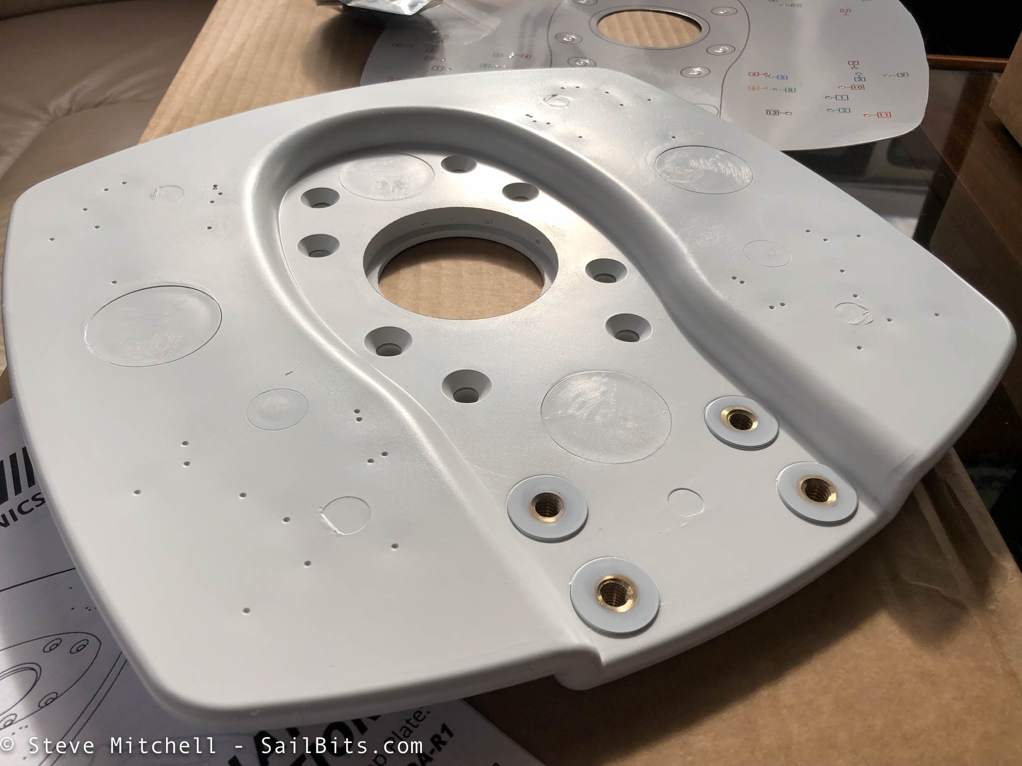 The plate itself quite heavy and appears to have metal inside of it coated with a starboard or plastic like substance. You can see tons of tiny dots on the outer edges, which indicate drill positions for various radars. In addition, the rear four threaded items are for the stern facing add on pole, which I would be installing. The 8 inset ones closer to the hole in the center were to mount it to the pole itself.