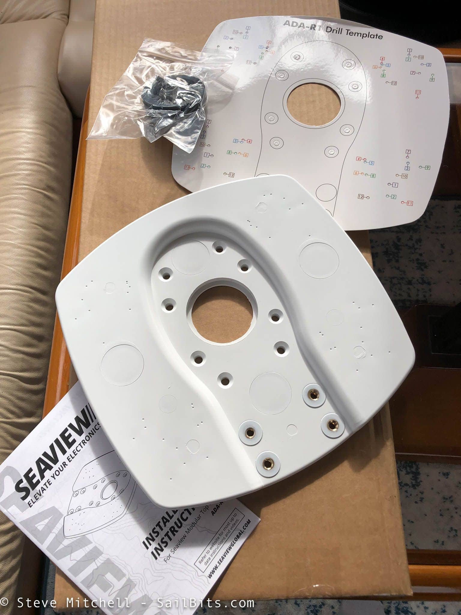 The modular top plate comes in a few different flavors, but this particular one seems like it is used for the majority of closed dome array radars. It comes with the mount itself, bolts for mounting it to the pole, a rubber seal for the middle hole, and a fun drill template.