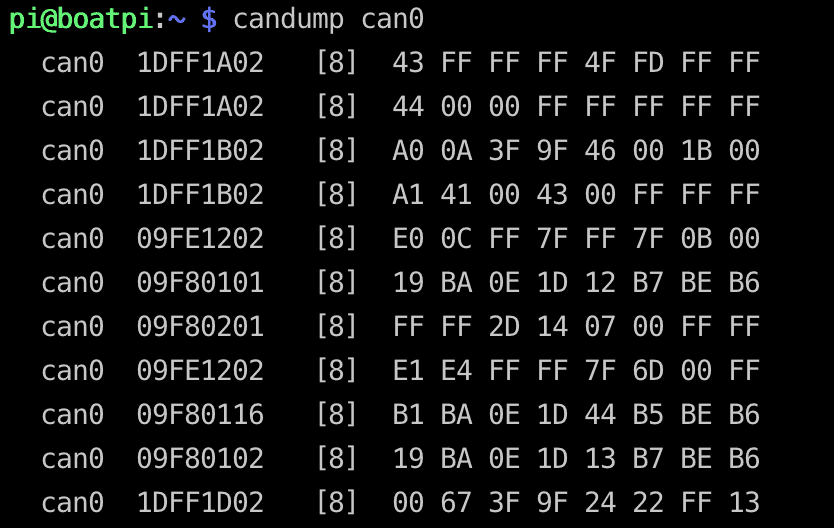 sudo systemctl enable socketcan-interface.serviceTo test that things are working correctly, you can use the command candump and see the raw traffic from the NMEA 2000 network.