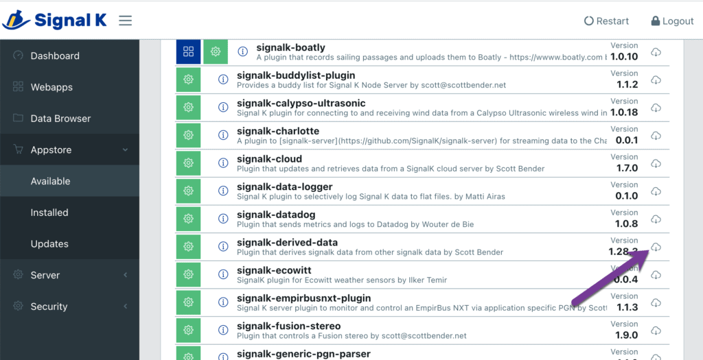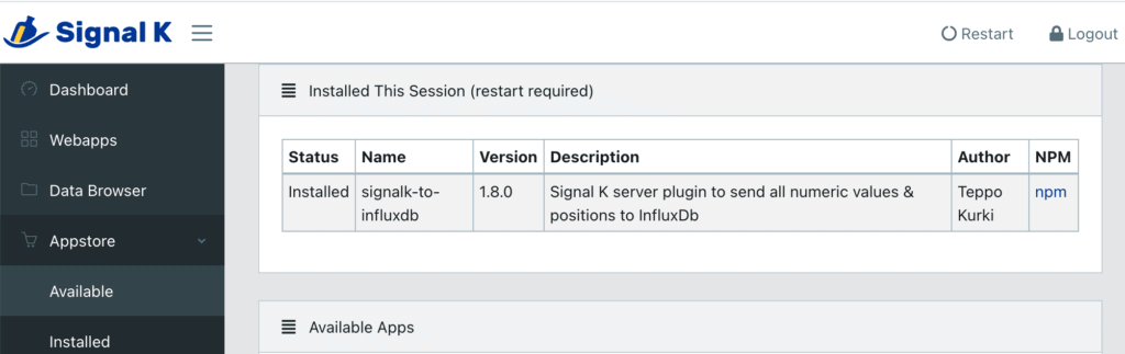 I will be installing various Signal K plugins I consider to be essential to effectively use the server, and those related to Grafana and InfluxDB.