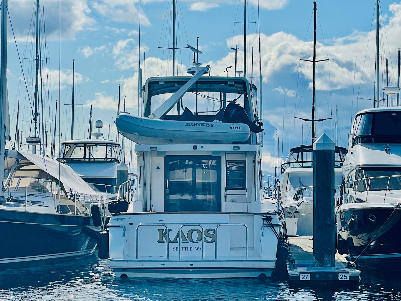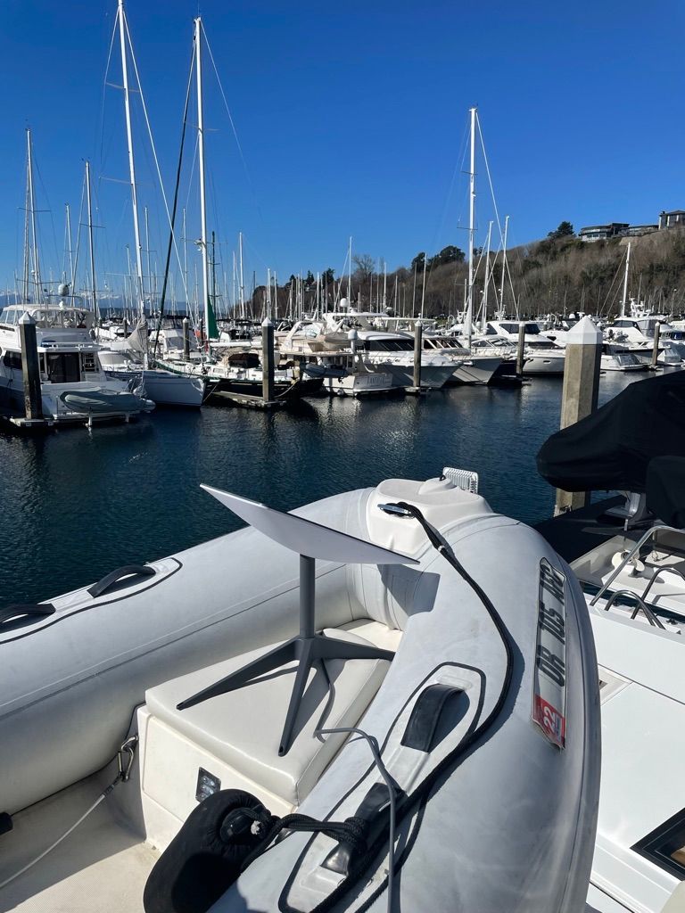 I originally just stuck the dish in the bow of my dinghy which is in a cradle on the upper deck of Kaos. For the first month or so of testing, this is where I used it from, and it did OK in most cases. Part of my arch and boat blocked it for some of the anchorages and docks I visited, but that was OK at the time. I definitely wanted to move it to a more optimal location for further testing.