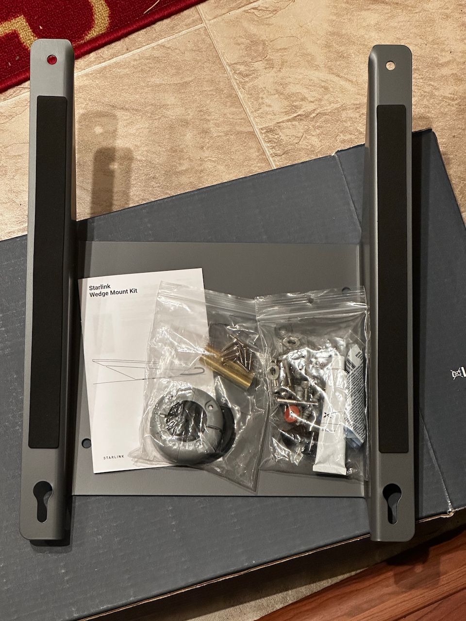 The wedge mount kit is a powder coated aluminum with holes both for the dish, and to mount it to a flat surface. There is also a hole for a cable gland, and pads on the top of the mount to cushion the dish. If you want to read installation details, you can find a PDF here.
