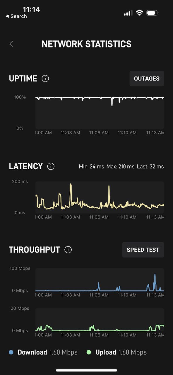 What was also different with the high performance dish is the spikiness of the power usage. The rectangular dish is pretty stable at 35 watts, sometimes going up to 50 watts if it's working hard, but pretty regular. With the high performance dish, I routinely saw spikes up to 100 watts during normal usage, 120 watts during speed tests, and a whopping 210 watts during boot times and when it is searching. Admittedly, these weren't for long periods of time, but it was still a lot more than I was used to seeing from the rectangular dish.