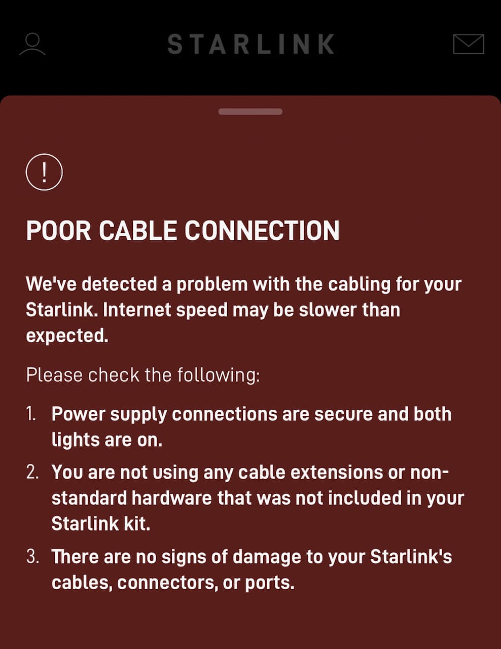 Speaking of cable concerns… I was underway today for about 1.5 hours, had a few waves I was dealing with, and some spray, although I doubt the water hit the Starlink. Nevertheless, when I arrived at the anchorage, I got this alert in the app that I’ve never seen before. I looked at the cabling, and didn’t see anything obvious, so I powered everything down, unplugged and reconnected everything, and it appears to be working fine.