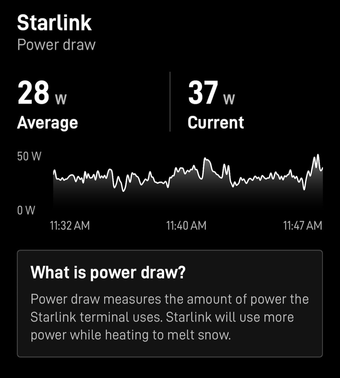 The power draw with the DC power supply has been good, well within what I would expect for a big dish like this. I did some testing back in June 2025 and power usage has gotten a little bit better since then. I assume that is as a result of firmware updates and optimization that Starlink has been able to figure out with things running in customer environments.
