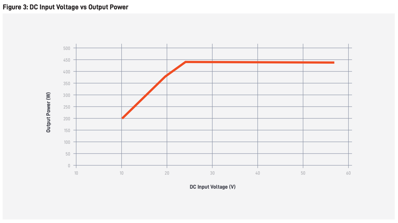 "Starlink Advanced Power Supply DC input was qualified for input voltages from 10.5V to 57V. However, it is recommended to power the system at DC voltages above 20V when possible. At lower input voltages, output power will be reduced to limit the total amperage from the power supply to less than 20 amps. In these cases, user terminals demanding high power (very high throughput with snow melt active) may throttle due to the power limitation."