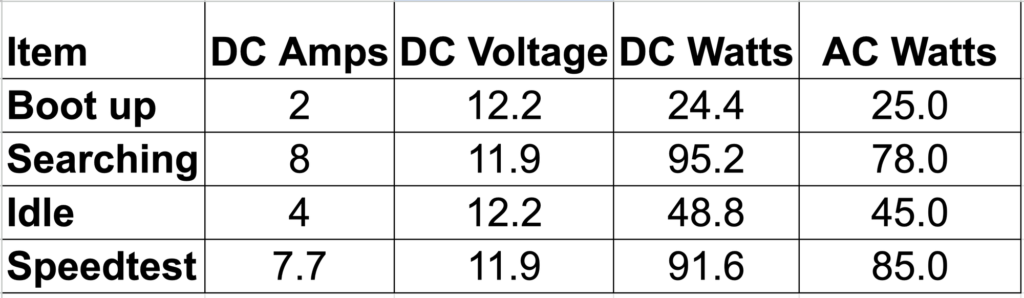DC power testing was a little more involved. I used a voltmeter to measure the real-time volts and a clamp meter to monitor the DC amperage, and a I did 40 tests and came up with these general averages: