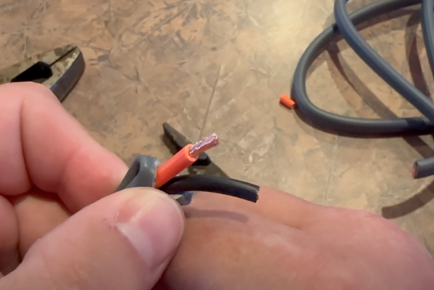 The wire inside appears to be 10 AWG or something similar. It is not tinned, so I recommend trying to keep it as waterproof as possible if you cut it by using heat shrink butt connectors or something similar.