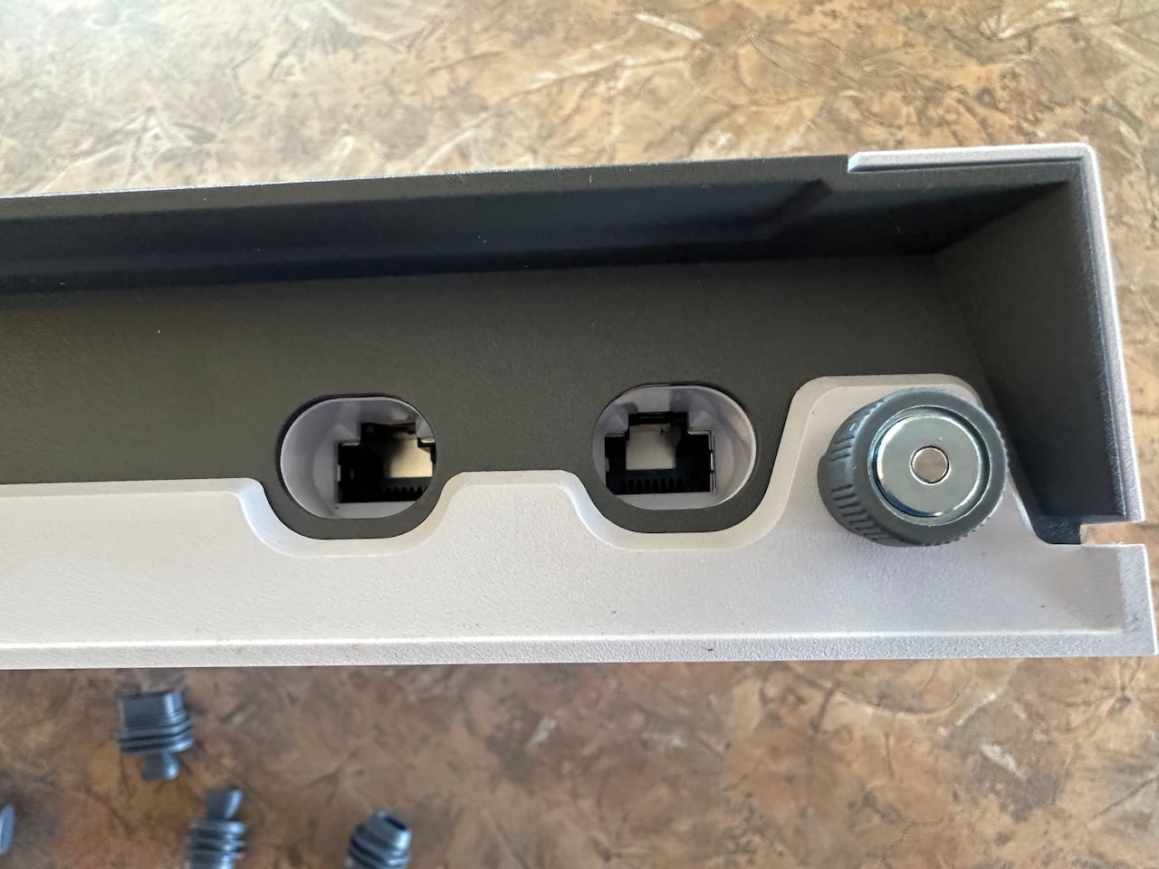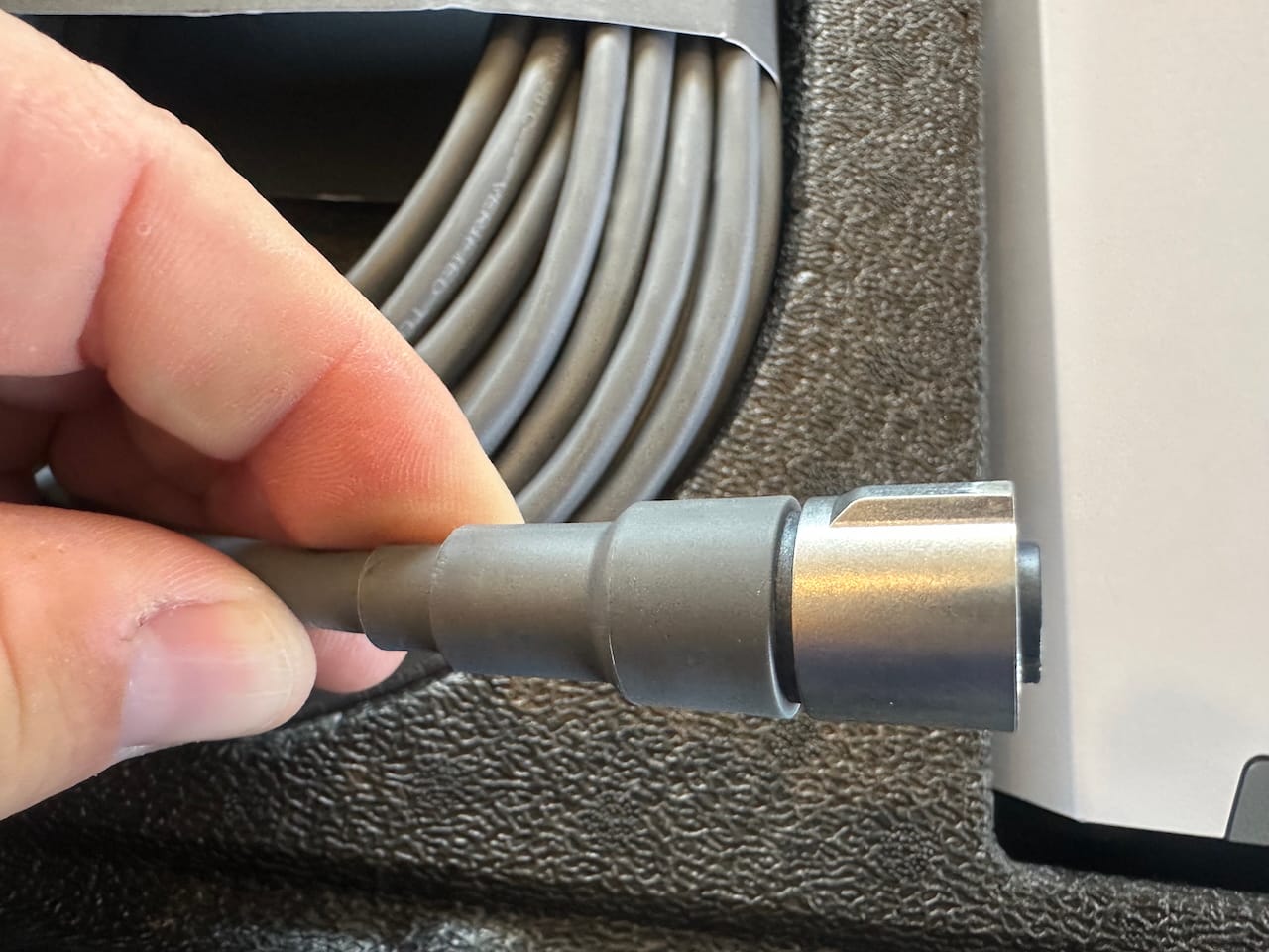 On one end is this spring loaded, stainless steel encased connector that goes directly into the dish. On the other end is a waterproof ethernet connector that goes into the power supply. This end feels extremely well built, and the spring action is really satisfying.