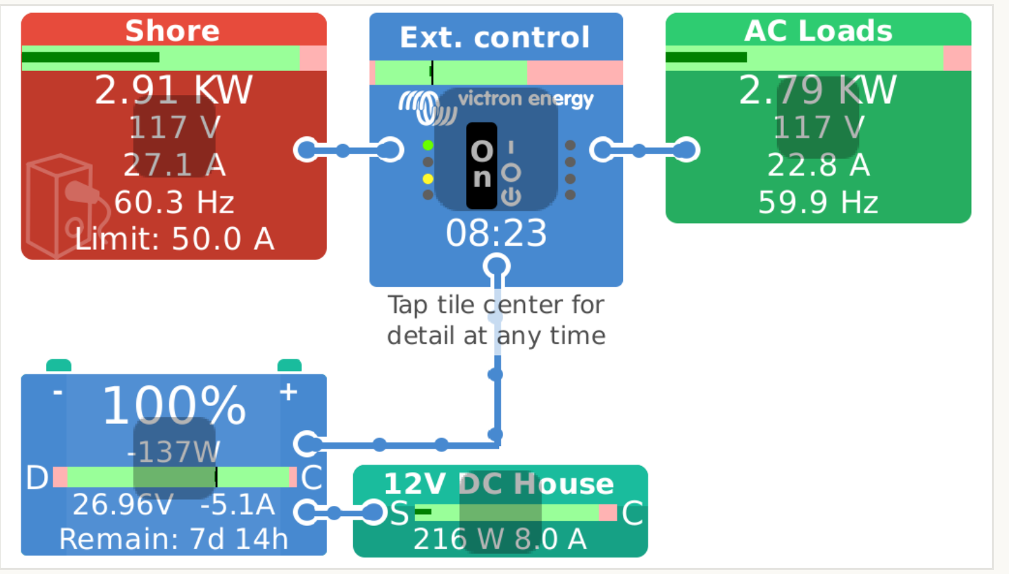One of the features that was added recently is the bars you see on each square. These are configurable, and can take some time to setup, but I think they're worth it. They're a graphical representation of the various warning and maximum power amounts for things like shore power, generator, inverter, and more.