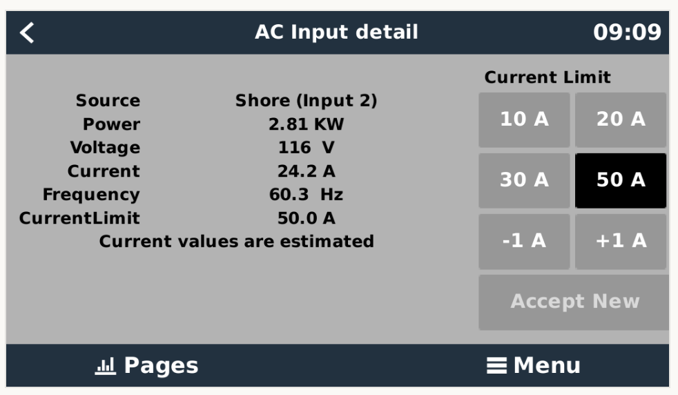 One of my favorite ones is the quick options for the AC Input, specifically Shore Power. This allows me to switch the input current limit very quickly instead of navigating to this in the default Victron pages and holding down the plus sign for a while. I visit a decent amount of places where the power is crappy, or only 30 amps, so being able to switch quickly is awesome.