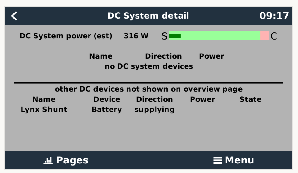 I have my system setup to show my "DC System" which allows me to monitor how much power is being used by the DC-DC converters that take 24 volts from my main battery bank and converts it into 12 volts for the various DC loads on the boat (you can see my overall system design at Kaos LiFePO4 electrical system v1) and any other native 24 volt loads.