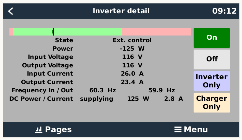 I use this screen for the big buttons on the right every so often. If I happen to be in a charge cycle with the generator running, and I need to shut the generator down or leave the boat, there is no way that Victron provides to let the generator cool down, and shutting it down when it is running hard is not cool. So I flip things to "Inverter Only" and that drops the load off the generator, albeit still quite quickly. I can then cool down the generator and shut it down.