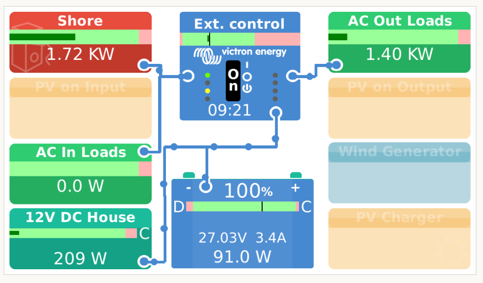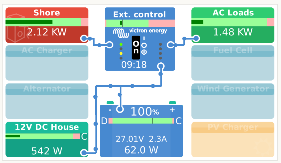 For more complex systems, there are dedicated versions of the summary screen to accommodate showing all of the inputs/outputs and data. The above example is for a DC coupled system that could include an AC charger, alternator, fuel cell, wind generator and PV charger. I think it would be interesting if you could enable/disable each of those objects - I'm guessing there's a way that I've not probably found.