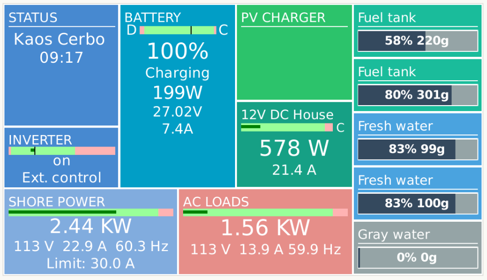 This looks super useful! Where is the data for tank levels coming from though? I don’t remember that being part of the system but perhaps you just focused on the lifepo4 aspects in the recent article. Looking for a reliable holding tank monitor solution and would be neat if it integrated with this UX and the rest of the Victron data perhaps.