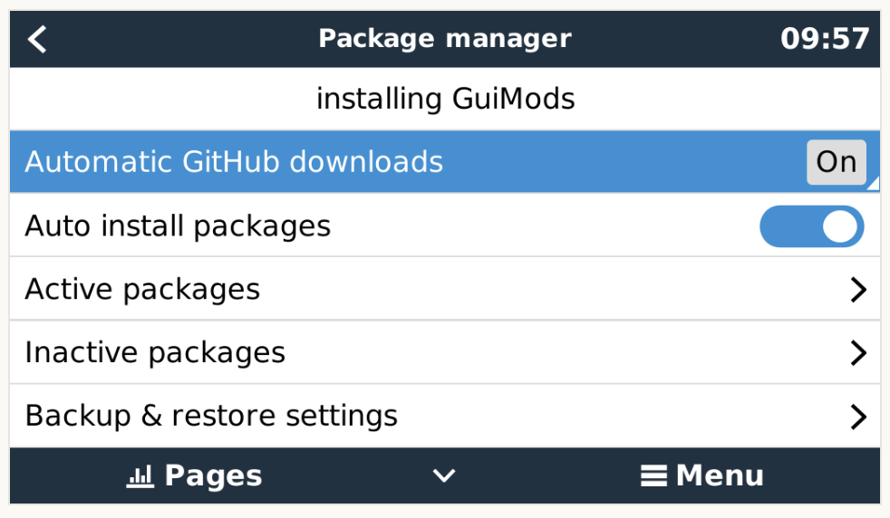 Once SetupHelper is installed, you can add GuiMods by placing the archive from its GitHub repo on a USB stick or SD card and inserting it in the GX device (CCGX, Cerbo, etc.). PackageManager will detect the archive and transfer the package to local storage. It will then appear in the Active packages list.