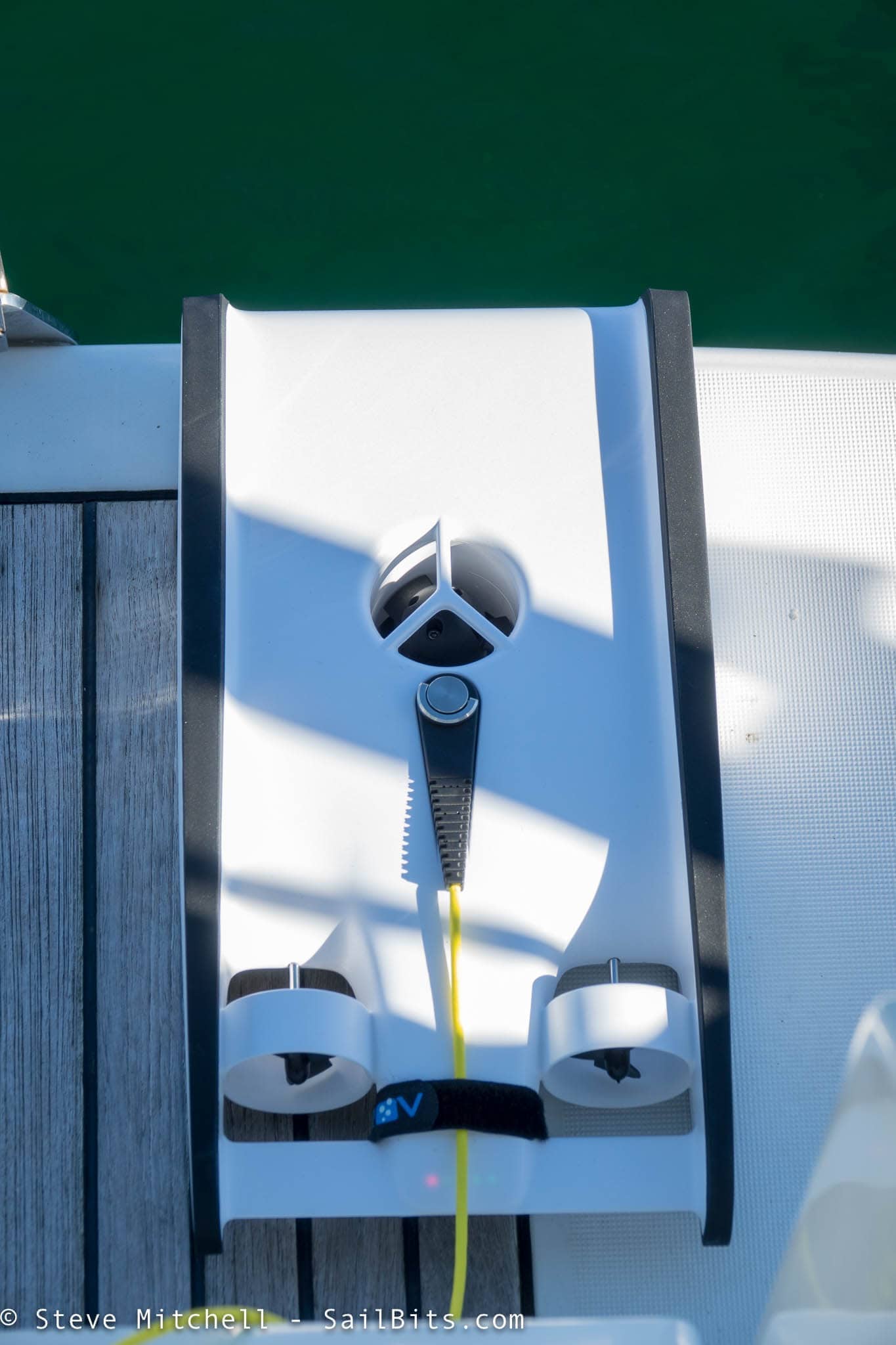 Here you can see the ROV ready to dive with the kevlar-reinforced tether attached, as well as the velcro holding it securely to the tail. The battery lights are also barely visible on the very stern of the ROV.