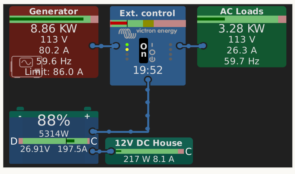 Charging has been really reliable as well. I have the system set to run the generator at 80% and it hums along without any issues. I do wish Victron had a slow start when the generator comes online - going from nothing to 80% in a few seconds sure doesn't make me happy, and I suspect the generator would agree. I had to do some experimentation to get the generator to a stable spot around 80% all of the time, and 86 amps (out of 100) seems to be that setting.