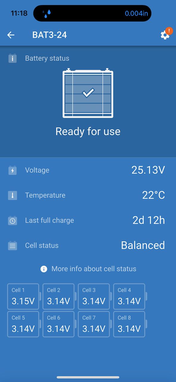 The last set of gear to get the update, at least on my boat, was the batteries. Now you can see their voltages, temperatures, and balance states all from the main screen. Really nice to see these on the main page of the Victron Connect app.