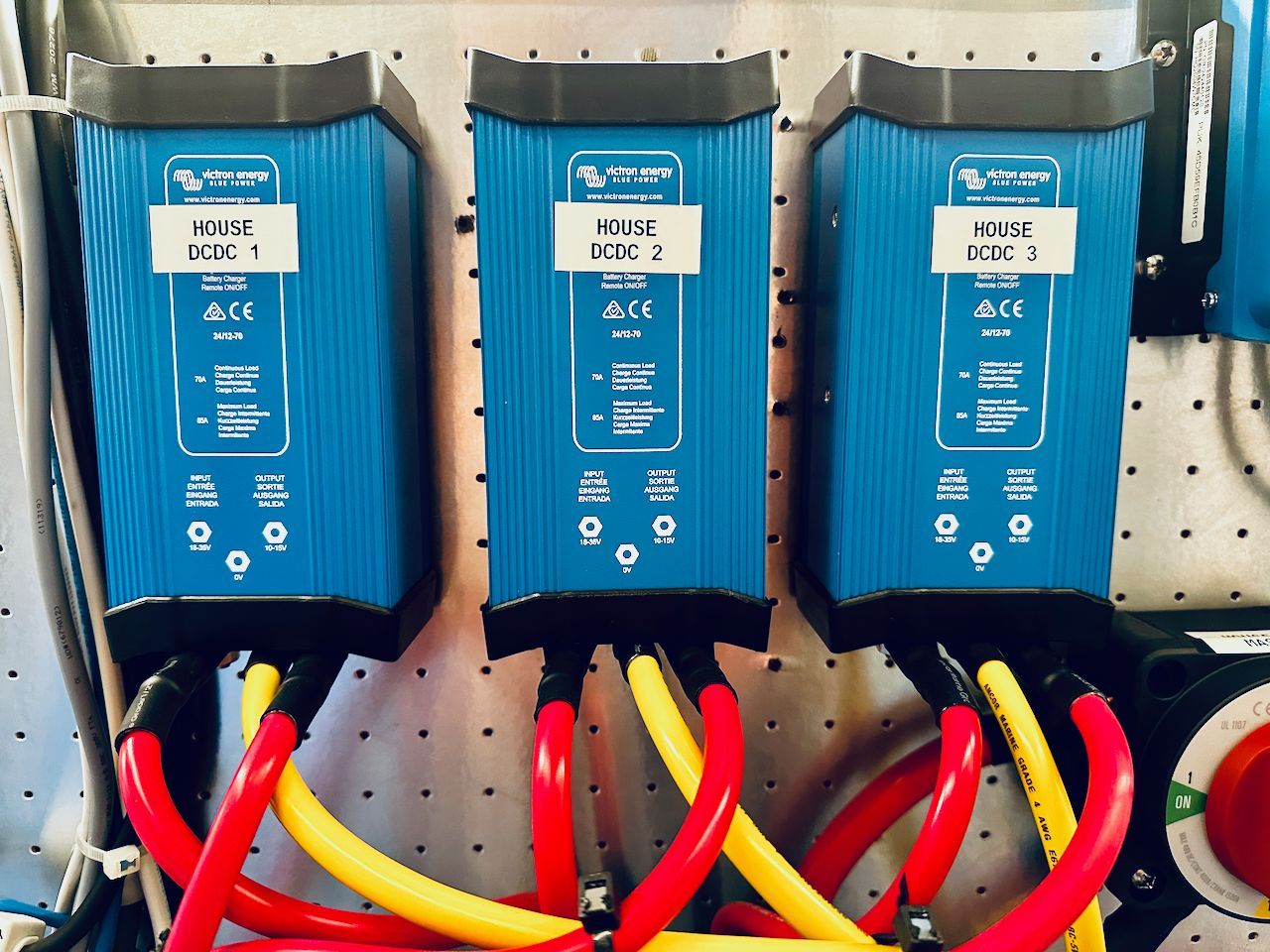 So I chose 24 volts for the "inverter bank" and used 3x 70 amp 24 to 12 volt DC-DC converters connected to it to provide 12 volt power to the existing system. The converters have worked flawlessly, barely ever getting warm, even when heavy DC loads are being used. They provide a nice, clean 13 volt DC output to the main DC panel, big Webasto diesel heater, windlass, davit crane, and more.