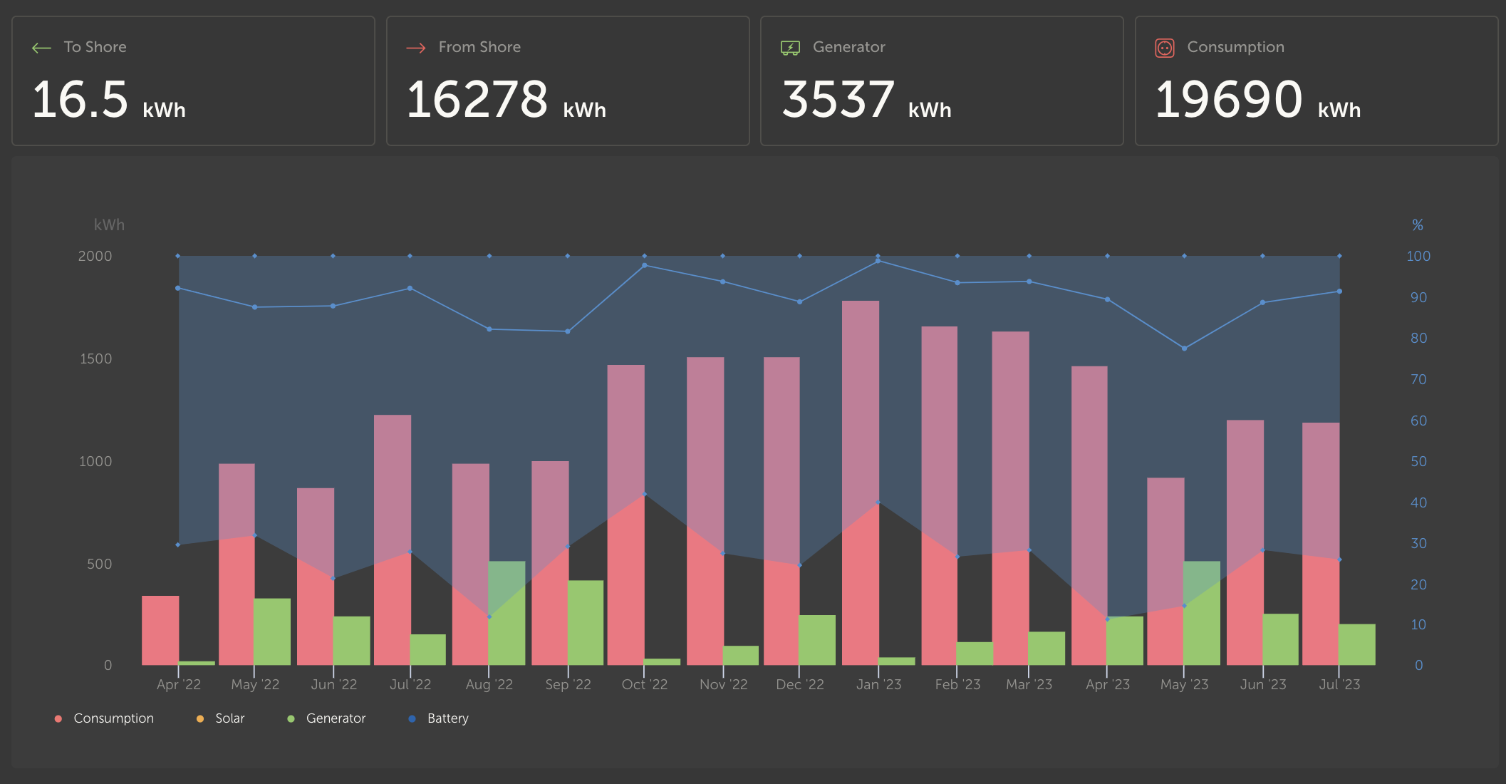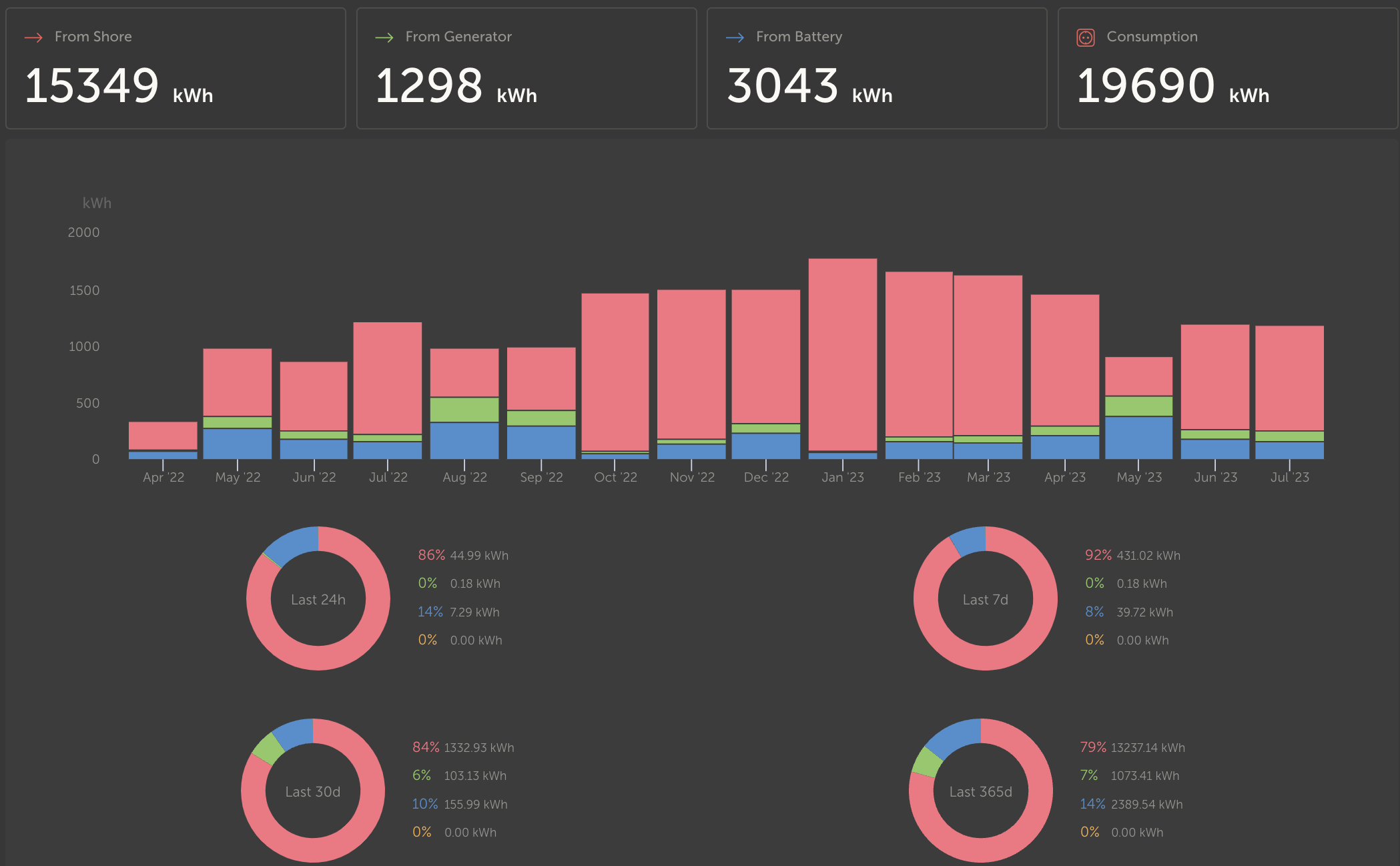The overview is great to see all of the power stats, but they also added specific graphs for shore and generator power (or tweaked the shore power one) to provide a bit deeper dive.