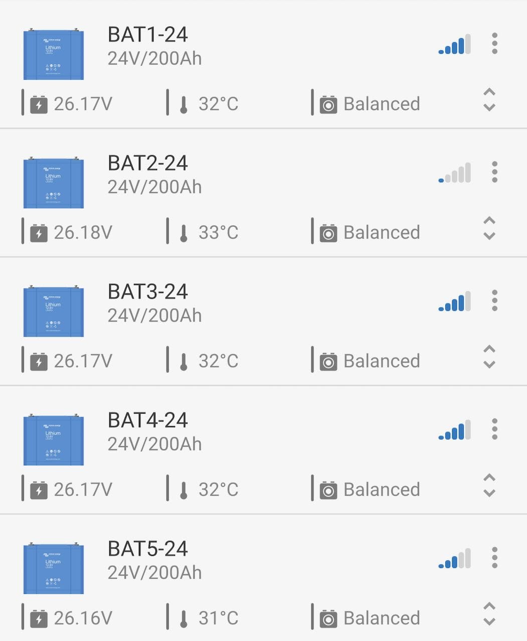 The per battery stats come from the batteries themselves. I have the Victron 24 volt, 200 amp hour models with a built in Bluetooth radio. That’s how the data is showing up - a firmware upgrade a few months ago (battery firmware upgrades always make me a little nervous!) enabled the data to be displayed on the Victron Connect app main screen.