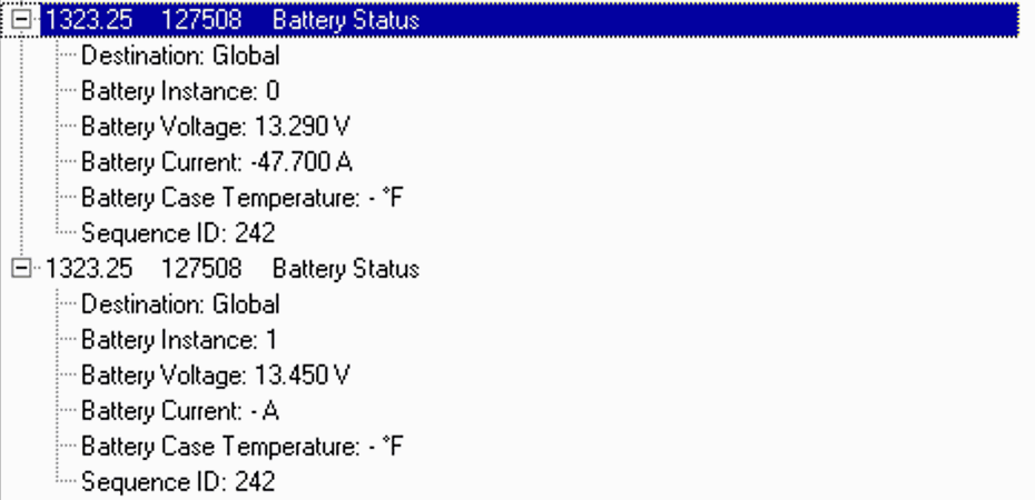 The battery PGN is good to have too, if you don’t have a BMV or other device monitoring your battery state. Unfortunately, there’s no way I’ve found to configure instance IDs, so this battery status PGN conflicts with the one being sent by the BMV.