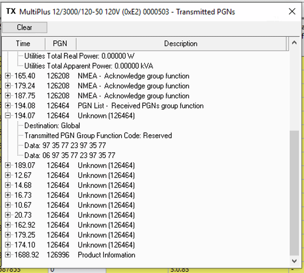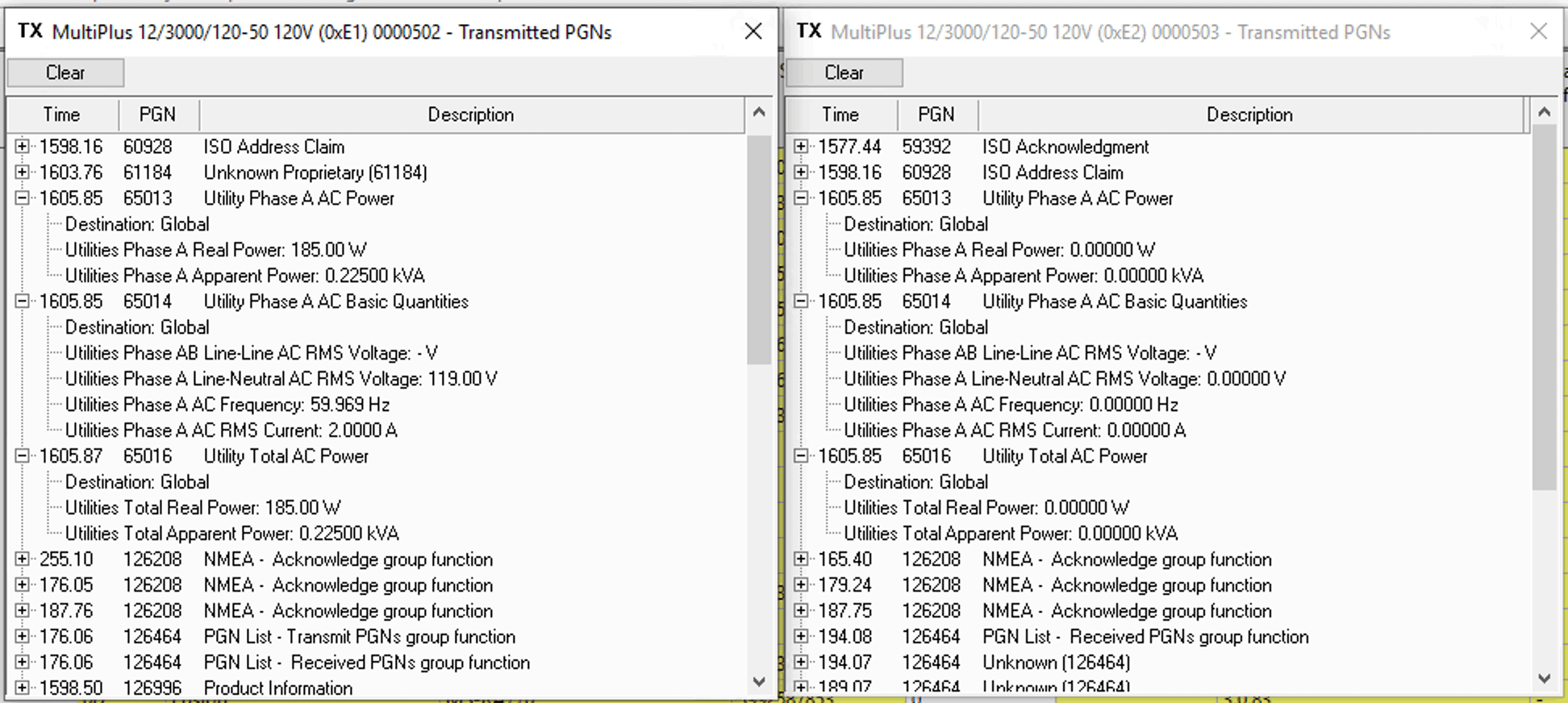 The above shows the left hand device, or 000502, which is the inverter side of things, but the PGNs for charger status, battery status, and inverter status. The charger and inverter status are useful, and pass along to other devices on the network to show the general state.