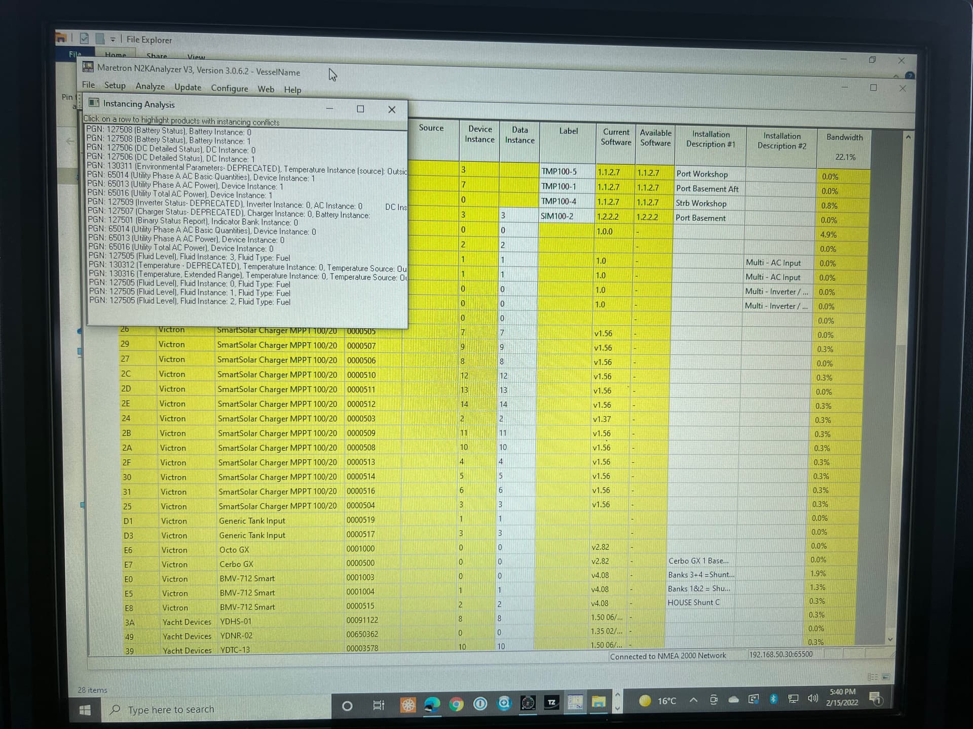 Thanks so much for this article. I am finally back to work on the Maretron system on MÖBIUS, and I have been at it for several days trying to get the Victron Cerbo to play nice with my N2K network. Your comments in the Victron Community about possibly having a bad cable sent me to considering other troubleshooting issues, and I switched my cable to the other VE can port and voila! Bad cables, bad ports. After that I got the OctoGX online too. But now with 14 MPPT Smart Solar controllers, 3 BVM712s, 5 Multiplus Inverter chargers, I have a huge long list of Instancing issues. Many of these seem to disregard the device instance and data instance which I can change in N2K Analyzer. Is this what you were referring to when you wrote, “Unfortunately, there’s no way I’ve found to configure instance IDs, so this battery status PGN conflicts with the one being sent by the BMV.” I have lots of conflicting battery status instances, and yet when I try to create an element on in screen in N2KView, it doesn’t find anything. Any suggestions as to how to make this mess work?