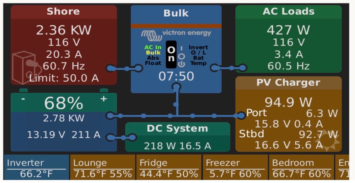 Within a few weeks, I replaced all of this with a single Victron MultiPlus 12 volt DC, 3000W inverter along with a Victron Cerbo, display screen, and a couple of 50 amp chargers to supplement charging while on generator.