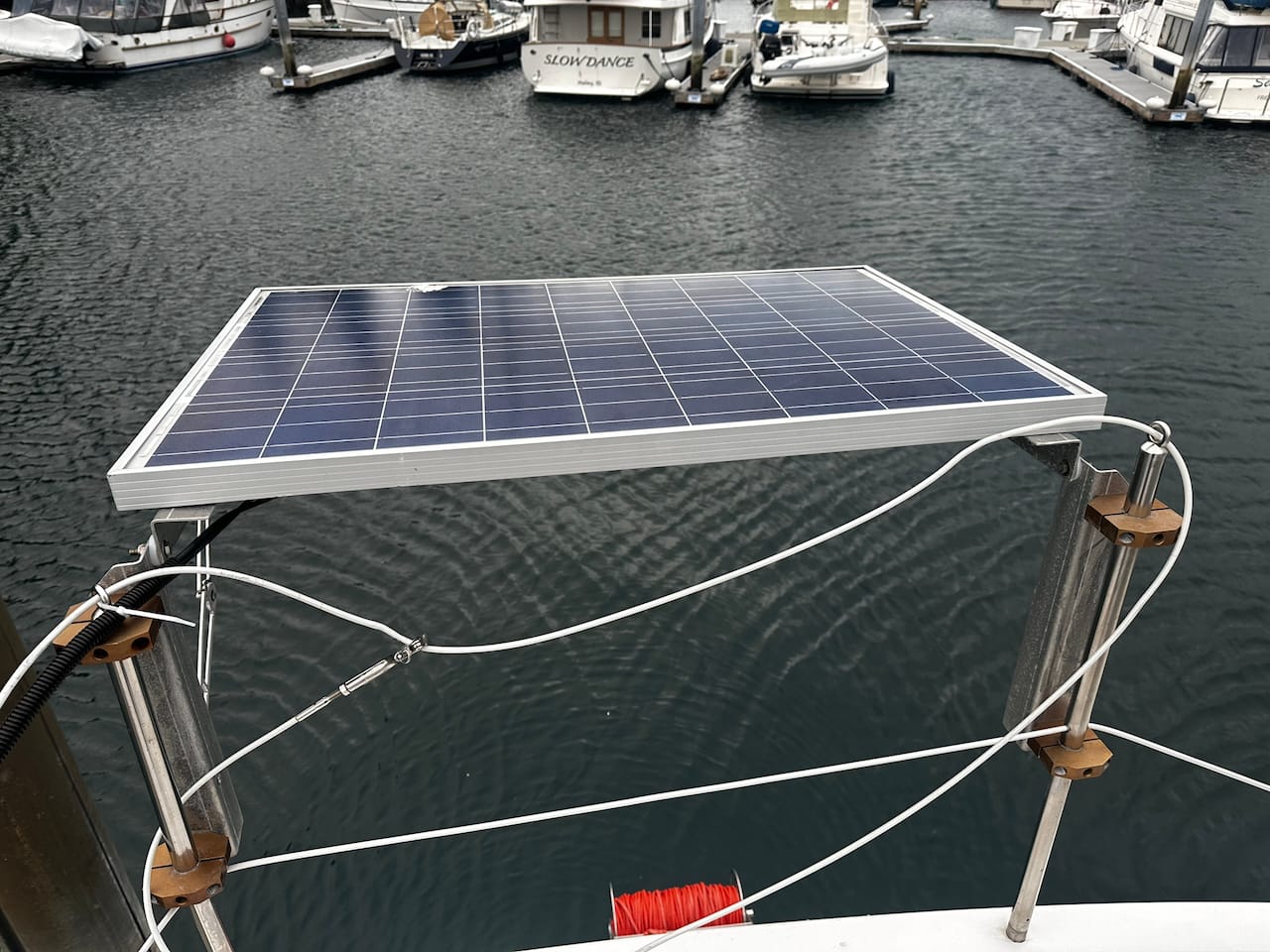 The solar situation on Aruna was also not great. She came with 8x 100 watt panels, four of which swung out from the sides of the boat and could be oriented flat for better charging. Half of the panels didn't work, and those that did had very poor performance. I found bare wires in multiple places with home made connectors and electrical tape that had been exposed to the elements. Some of these wires were touching metal parts of the boat (remember, Aruna is steel) so there was current flowing around random places. Fun.