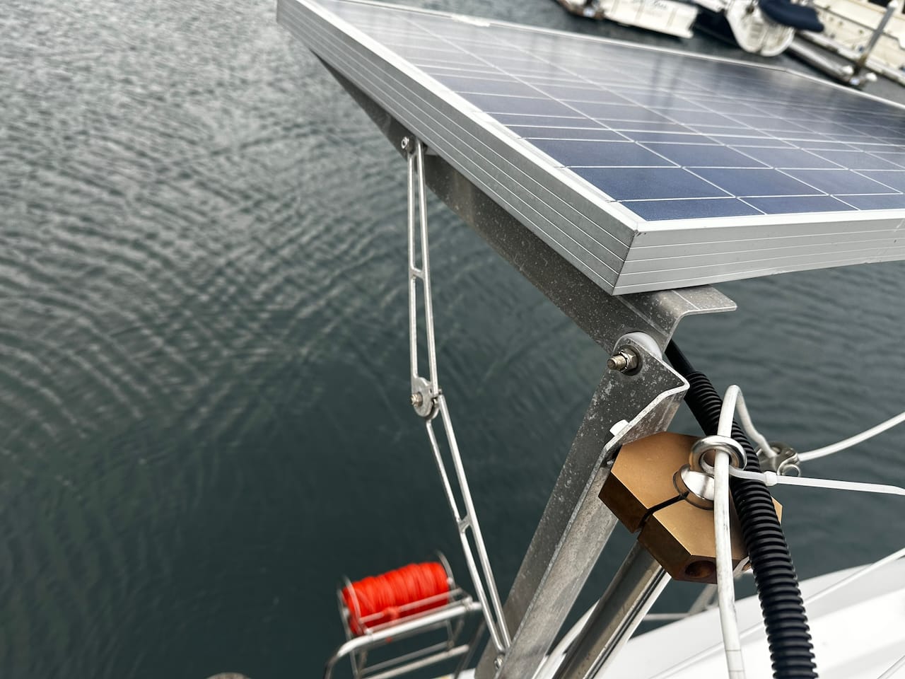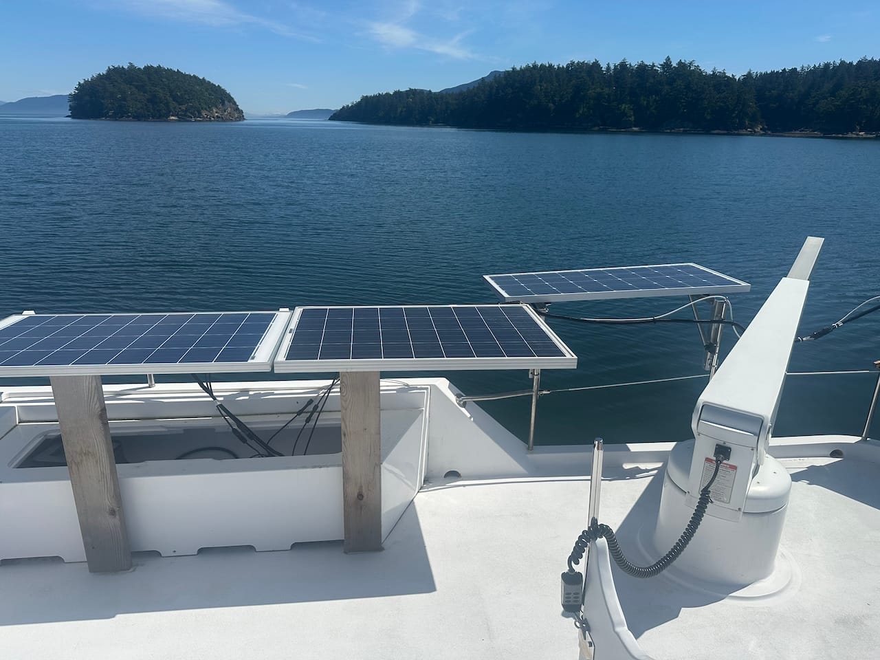 The solar situation on Aruna was also not great. She came with 8x 100 watt panels, four of which swung out from the sides of the boat and could be oriented flat for better charging. Half of the panels didn't work, and those that did had very poor performance. I found bare wires in multiple places with home made connectors and electrical tape that had been exposed to the elements. Some of these wires were touching metal parts of the boat (remember, Aruna is steel) so there was current flowing around random places. Fun.