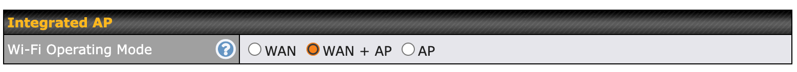 - WAN In this mode, all radios operate as Wi-Fi WAN. No local Wi-Fi network will be created.