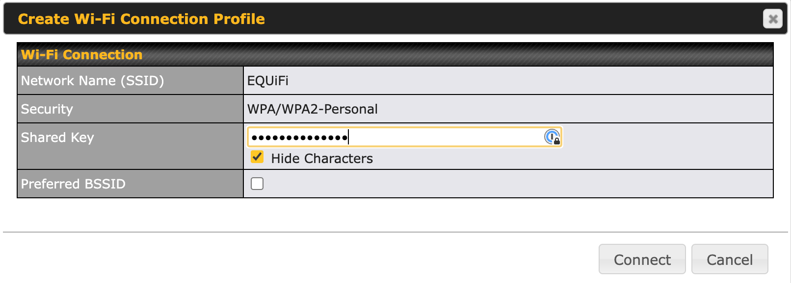 You can click on Connect, provide a password, and also pick a "Preferred BSSID" which allows you to lock your connection to a particular channel/radio/device, which I don't recommend unless you have a particular performance reason to do so.