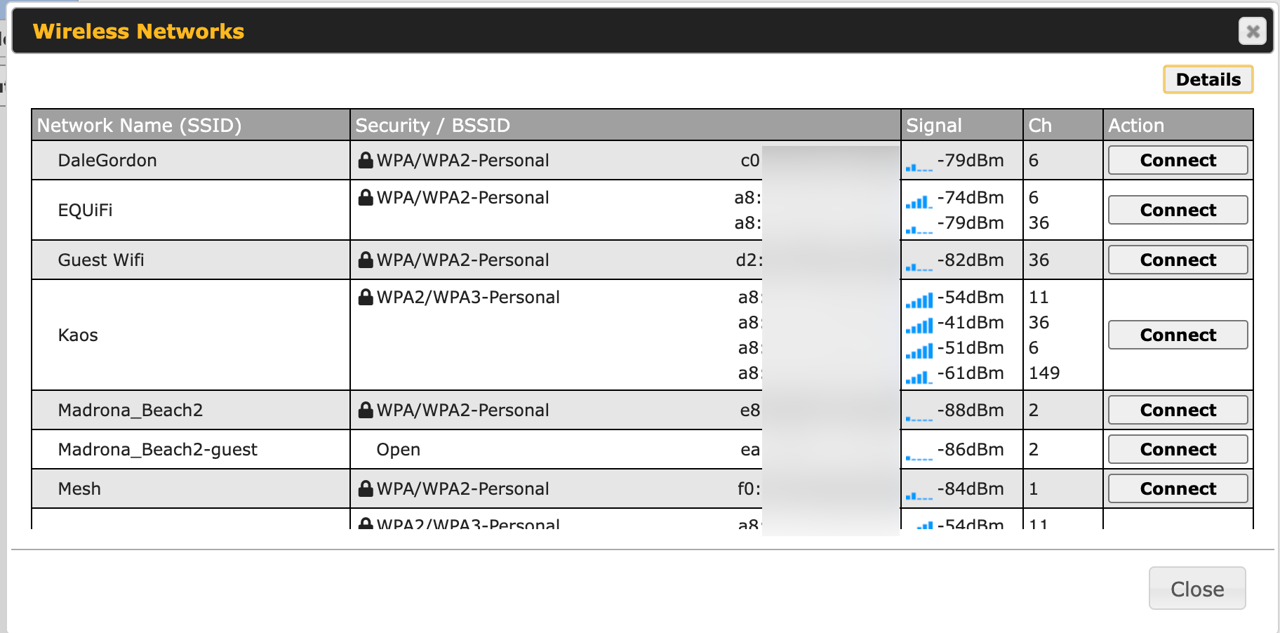 You'll get a list of WiFi networks, signal strengths, security information, and more.